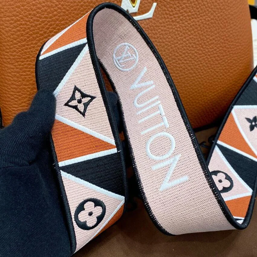This beautifully crafted top handle handbag offers a sophisticated silhouette made from luxurious Taurillon leather. It features a striking, wide, and colorful strap that showcases an intricate graphic design of triangles and floral-inspired motifs, a detail that requires several hours of precise embroidery. This removable strap provides a vibrant contrast to the bag’s classic form, making it a versatile statement piece for any collection.