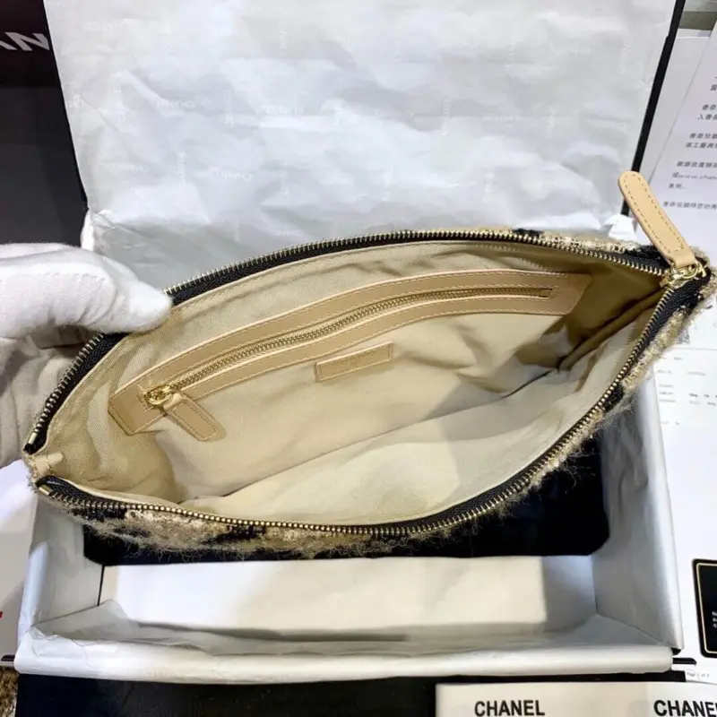 This clutch is designed to carry your essentials with grace. The secure top zip closure ensures your belongings are safe, while the gleaming gold-tone hardware adds a subtle, luxurious finish. Its generous size makes it a versatile and indispensable addition to your accessory collection.