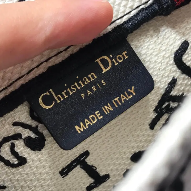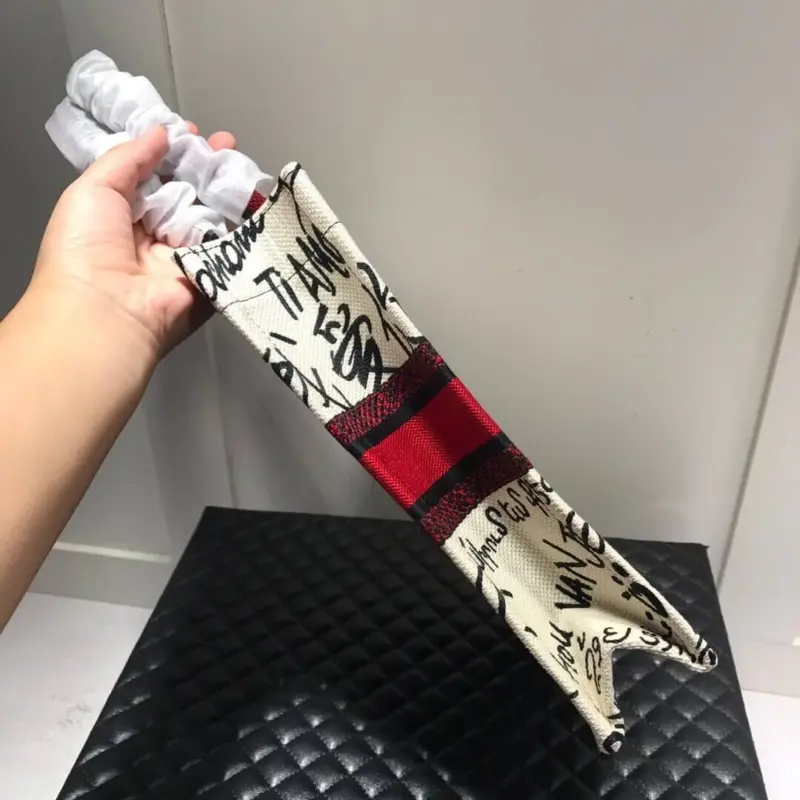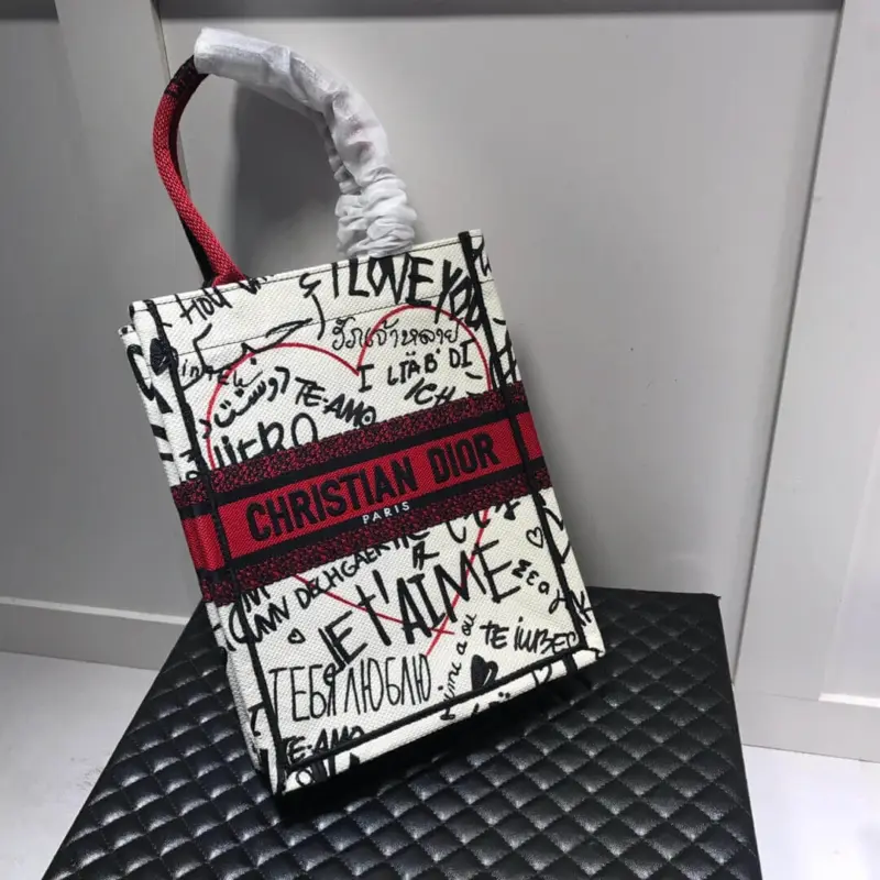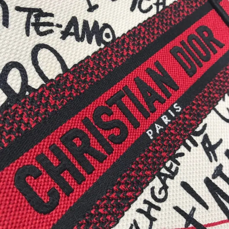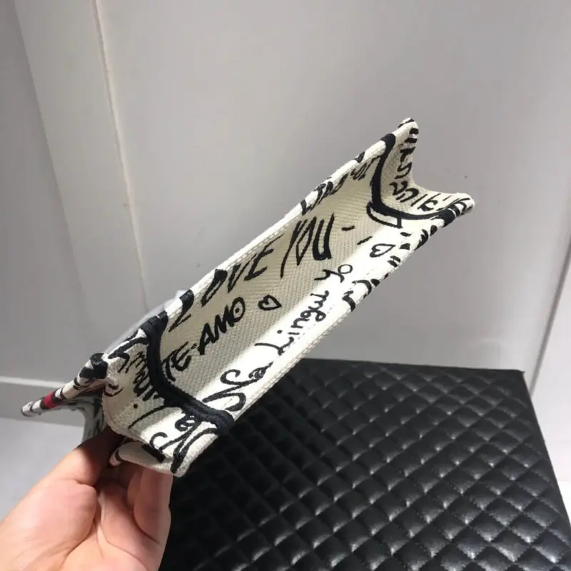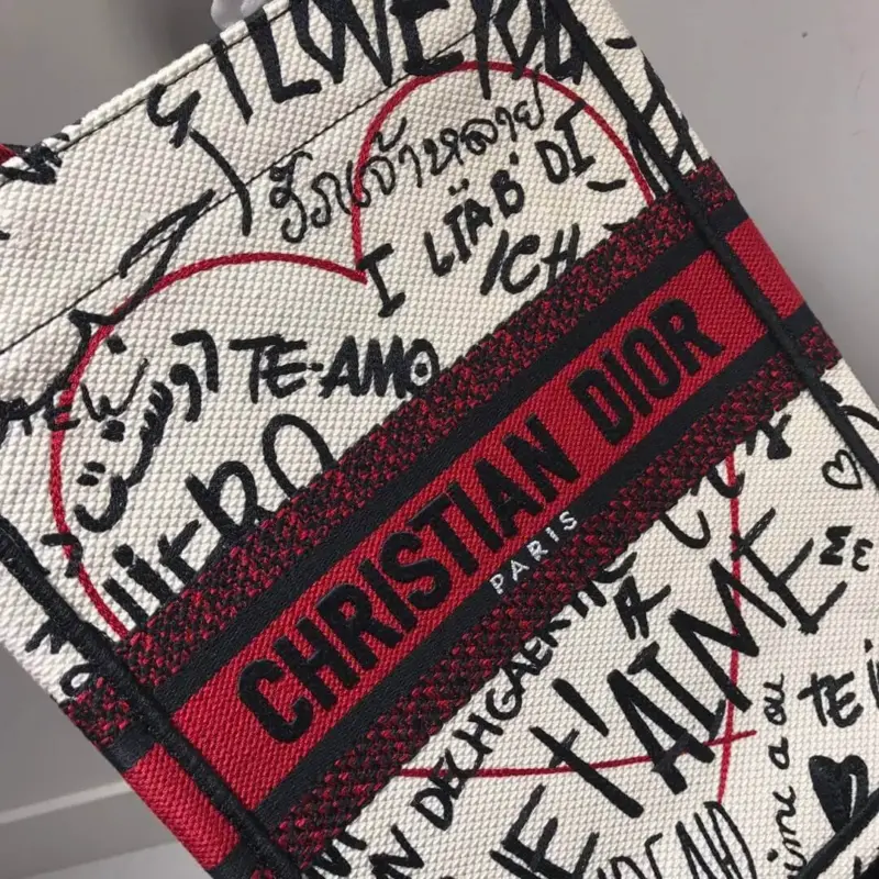 The entire exterior is covered in intricate embroidery, featuring a vibrant graffiti motif that artistically declares the words ‘I love you’ in 38 different languages. This unique and romantic detailing, combined with a prominent signature on the front, makes the tote a standout example of detailed craftsmanship.
