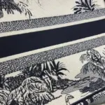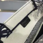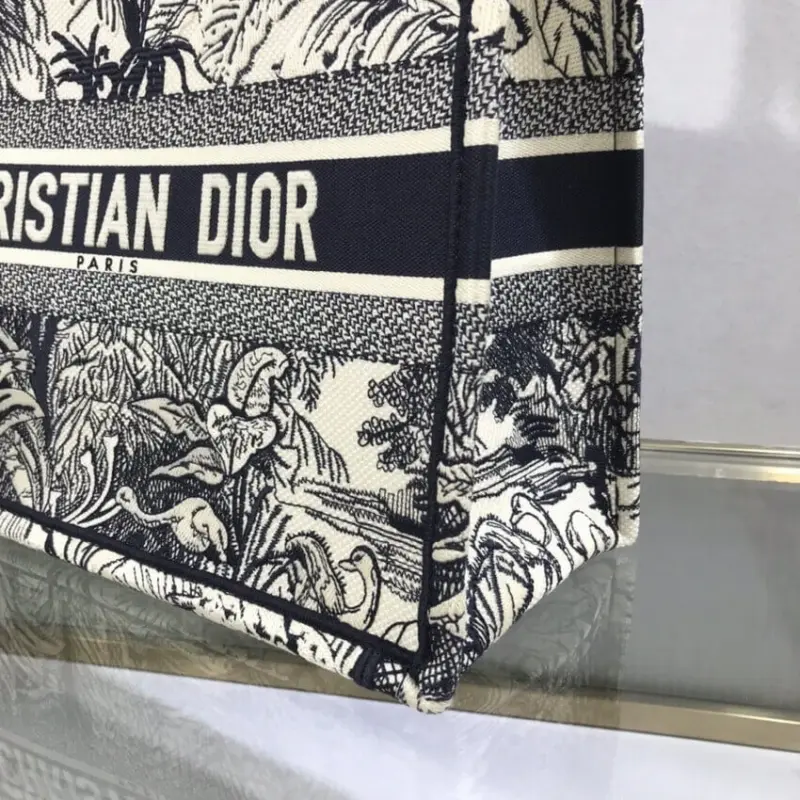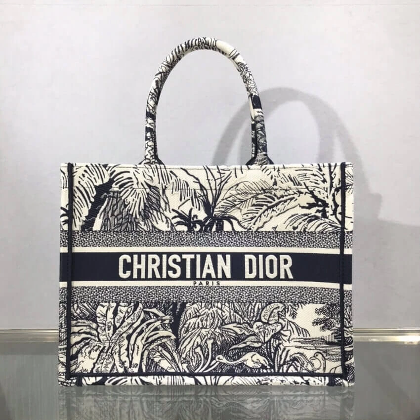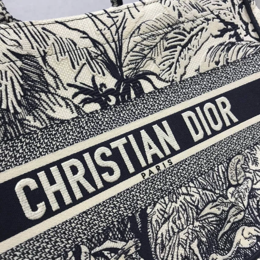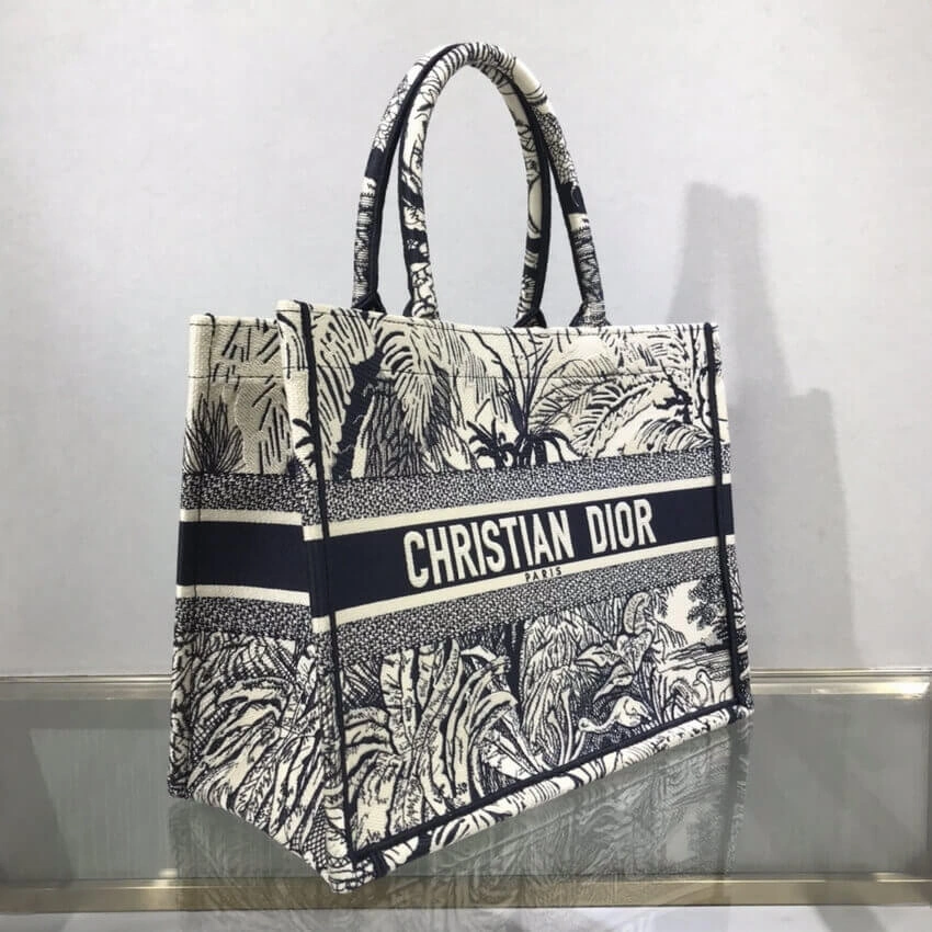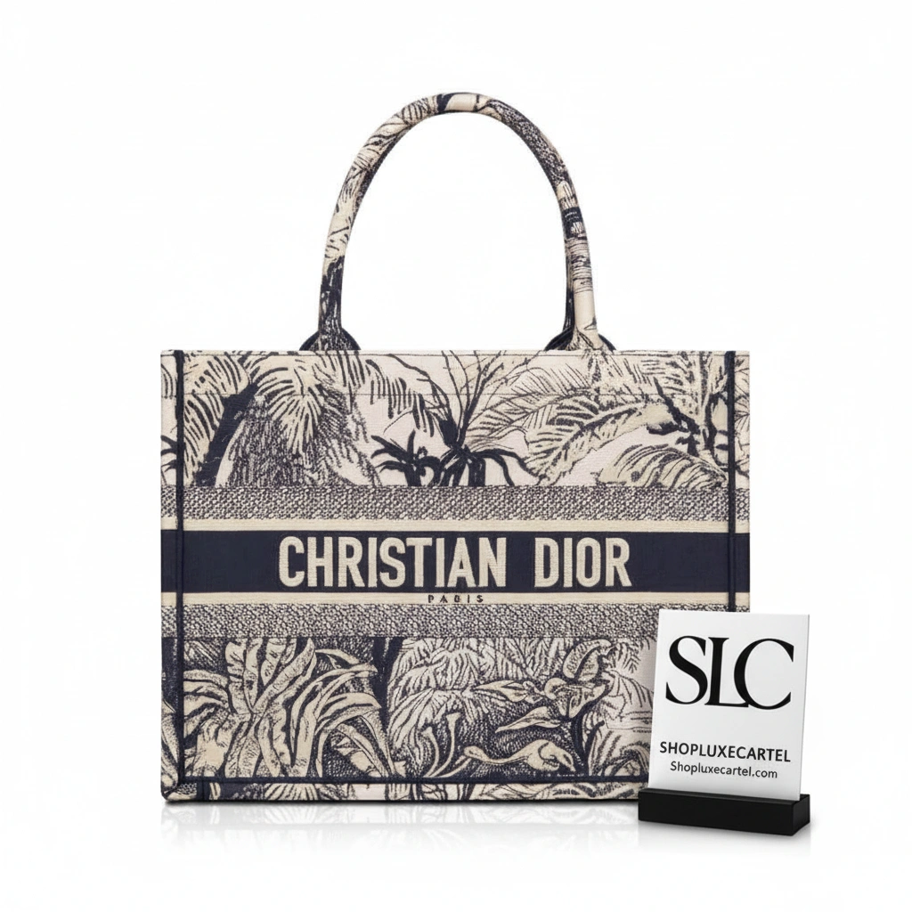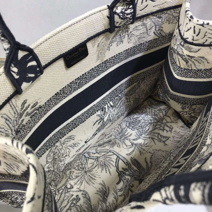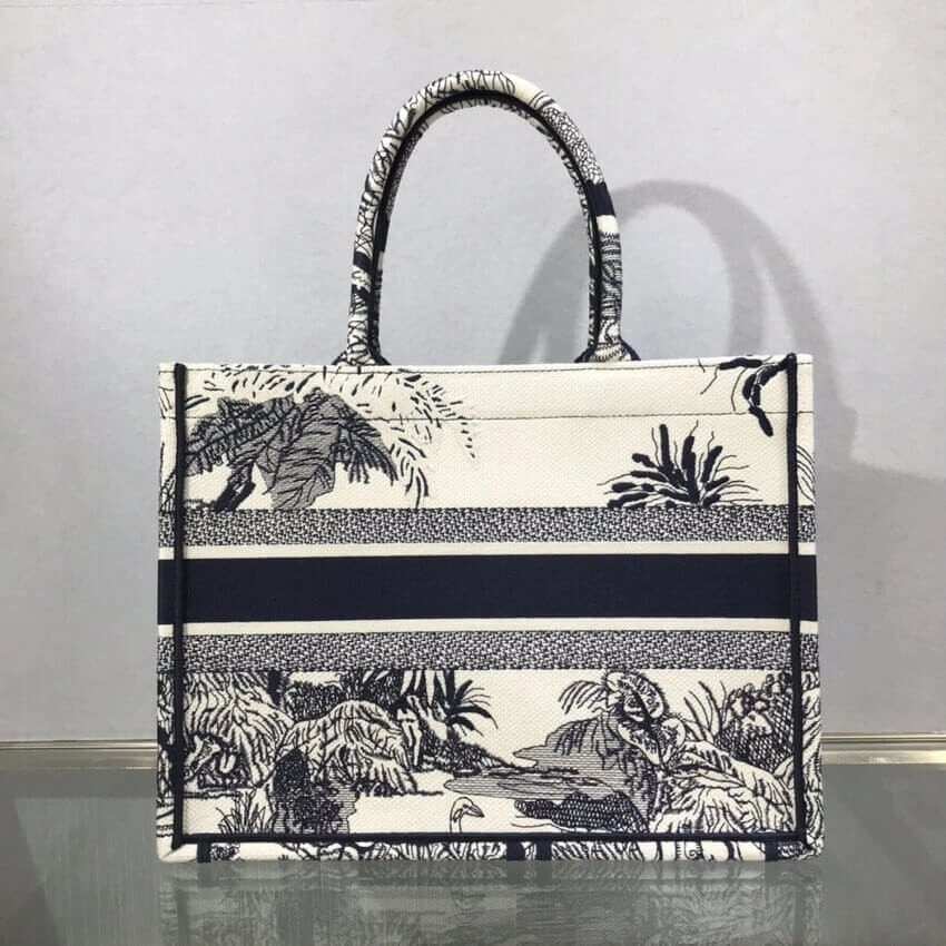 An elegant and original design, this small tote has become a staple of a sophisticated aesthetic. Expertly crafted to carry all your daily essentials, the compact silhouette is distinguished by its fully embroidered blue Toile de Jouy-style palm motif. This bag is a prime example of exquisite savoir-faire.