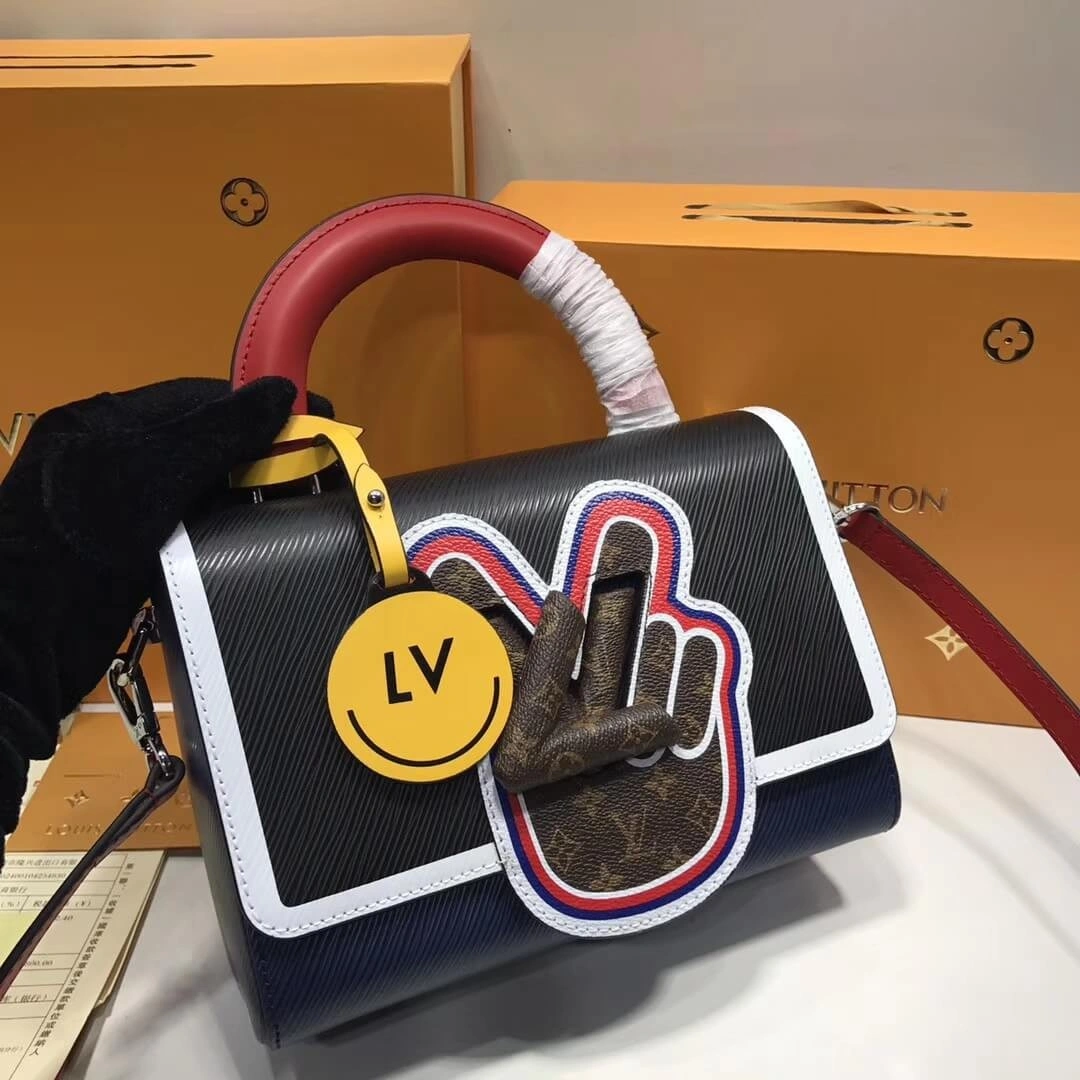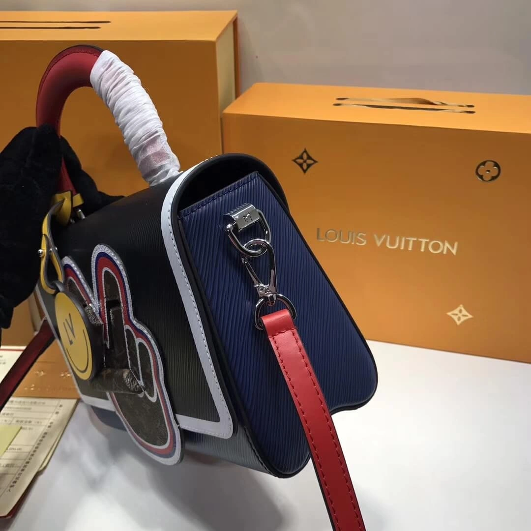 - Textured Epi leather with embroidered details and a patterned canvas patch
