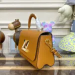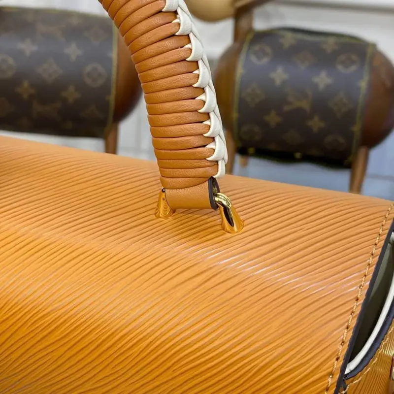 This beautifully structured handbag combines timeless design with modern functionality. Crafted from a distinctive epi-grained leather in a warm honey gold hue, its graphic shape is softened by feminine braided leather details on the top handle and the unique twist-lock closure. The bag’s thoughtful construction offers both elegance and practicality for any occasion.