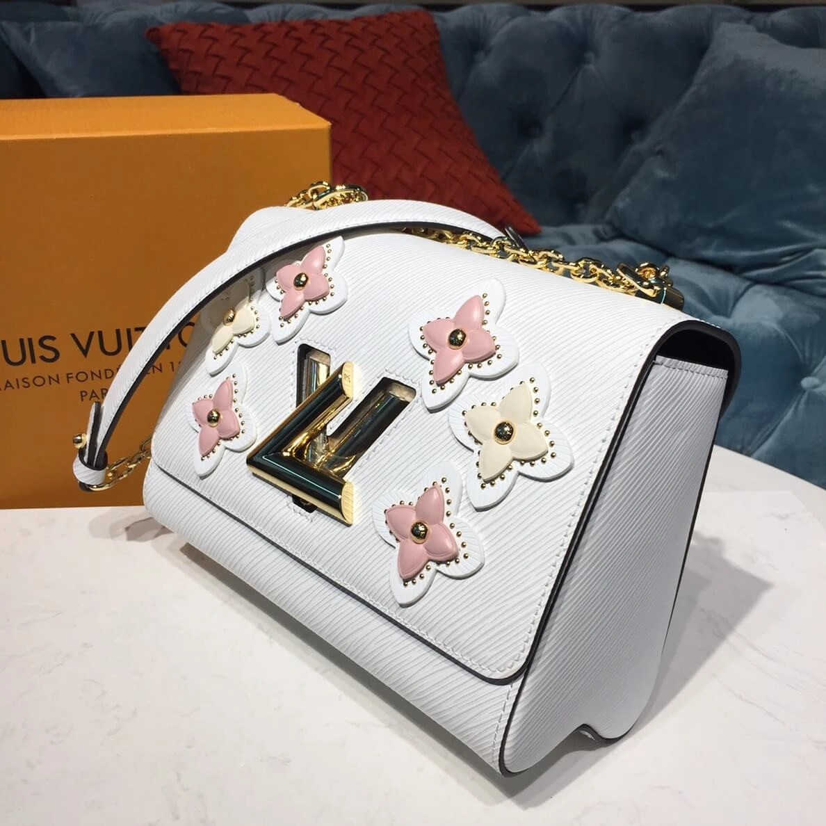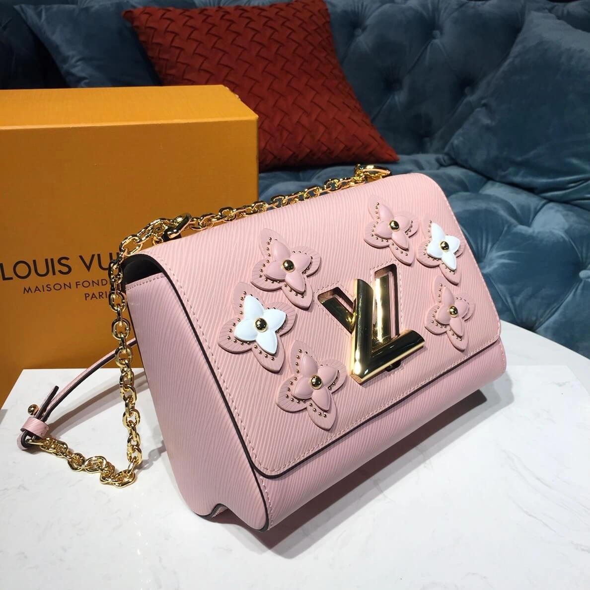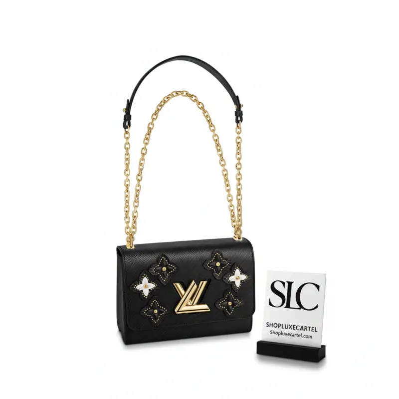 This beautifully crafted handbag showcases a stunning floral theme, featuring intricate flowers made from layered leather and polished studs. The design artfully reinterprets an emblematic pattern, creating a sophisticated look against the richly textured epi leather. This bag’s meticulous construction gives a subtle nod to the heritage of classic trunk-making.