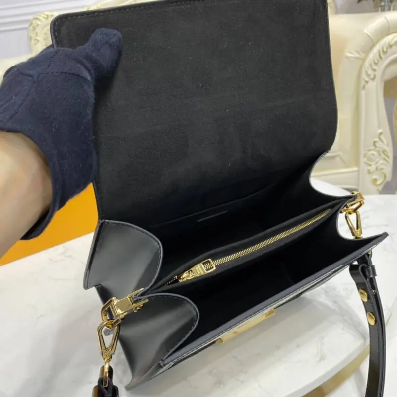 Designed for both style and function, the thoughtfully organized interior includes multiple compartments to keep your essentials in order. A removable chain and an adjustable leather strap provide several carrying options, allowing you to wear it as a crossbody, a long shoulder bag, or a shorter, dressier style.