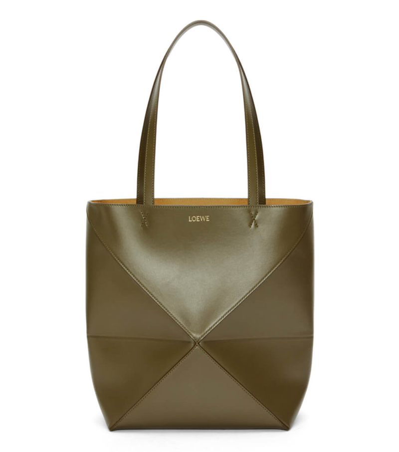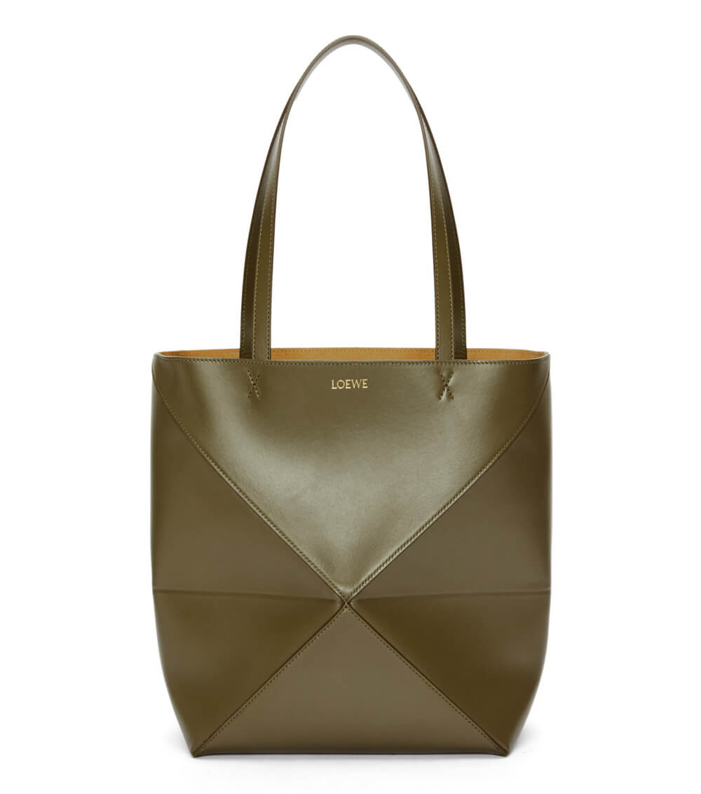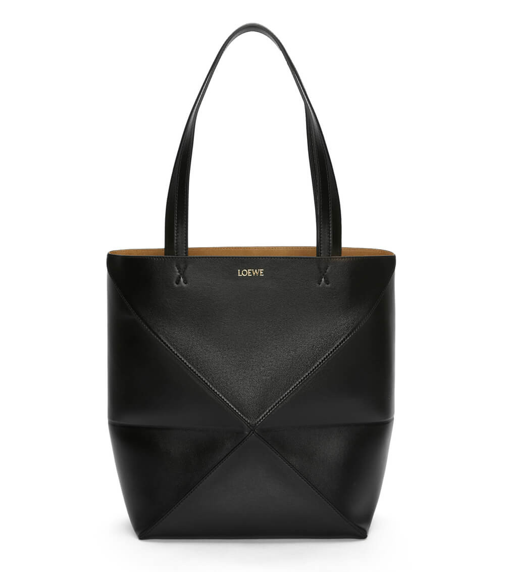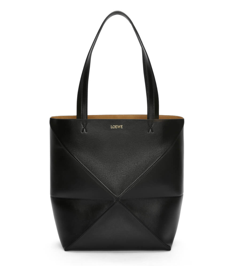 This tote bag features an innovative design inspired by clean, geometric lines. Its clever construction, with graphic and architectural panels, allows it to fold completely flat, making it an ideal companion for travel and easy storage. Crafted from shiny, supple calfskin, this bag offers a soft and lightweight feel while combining inventive design with everyday practicality.