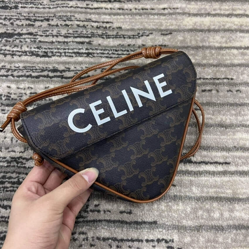 Showcasing a unique and modern silhouette, this geometric triangle bag is a standout accessory for any wardrobe. It is crafted from a durable, coated canvas featuring a sophisticated monogram print, elegantly finished with genuine calfskin trimmings. The polished gold-tone hardware adds a touch of classic refinement to its contemporary design, making it a versatile piece for both day and evening wear.