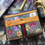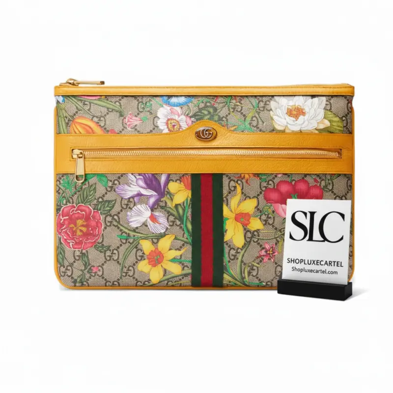 Experience a masterful blend of timeless patterns with this elegant and versatile travel pouch. The design features a classic monogram print beautifully layered with a vibrant, vintage-inspired floral motif. Accented with bright yellow leather trim and a signature striped webbing detail, this pouch offers a contemporary look rooted in classic style. It is the perfect accessory for organizing essentials, whether used on its own as a chic clutch or slipped inside a larger bag.
