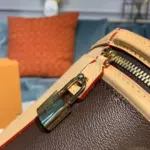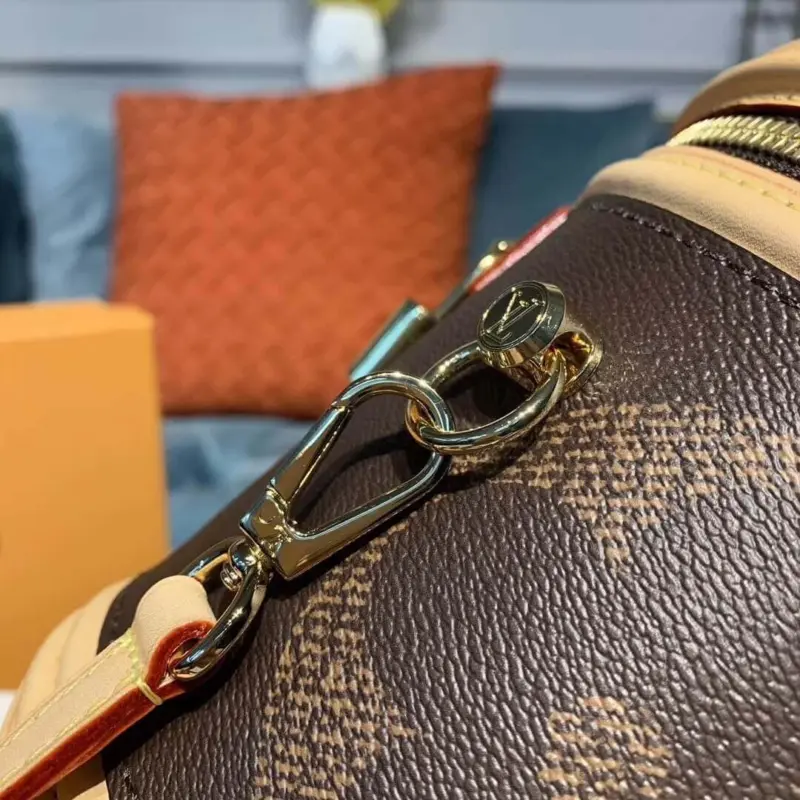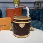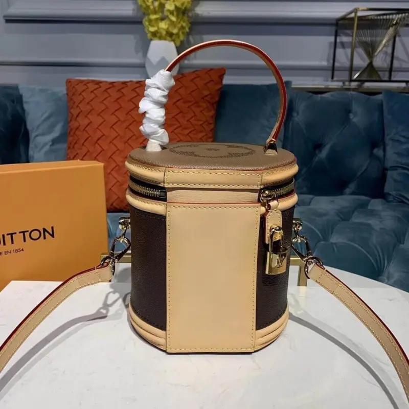 Designed for versatility, this case features a refined top handle for handheld carrying and also includes a detachable, adjustable leather strap that allows for comfortable shoulder or crossbody wear. The design is elegantly finished with aged cowhide leather trim and gleaming gold-tone hardware, blending iconic style with practical, everyday use.