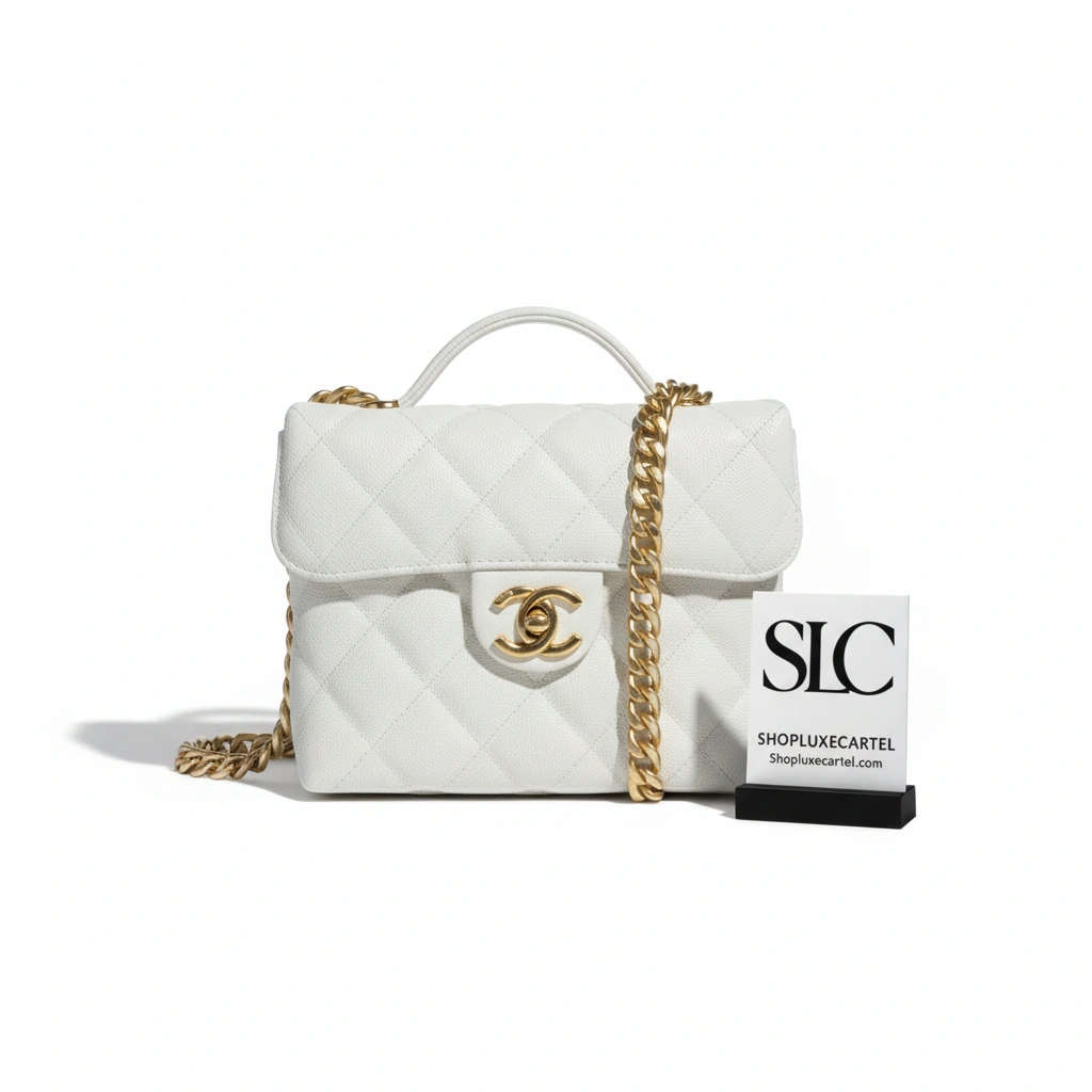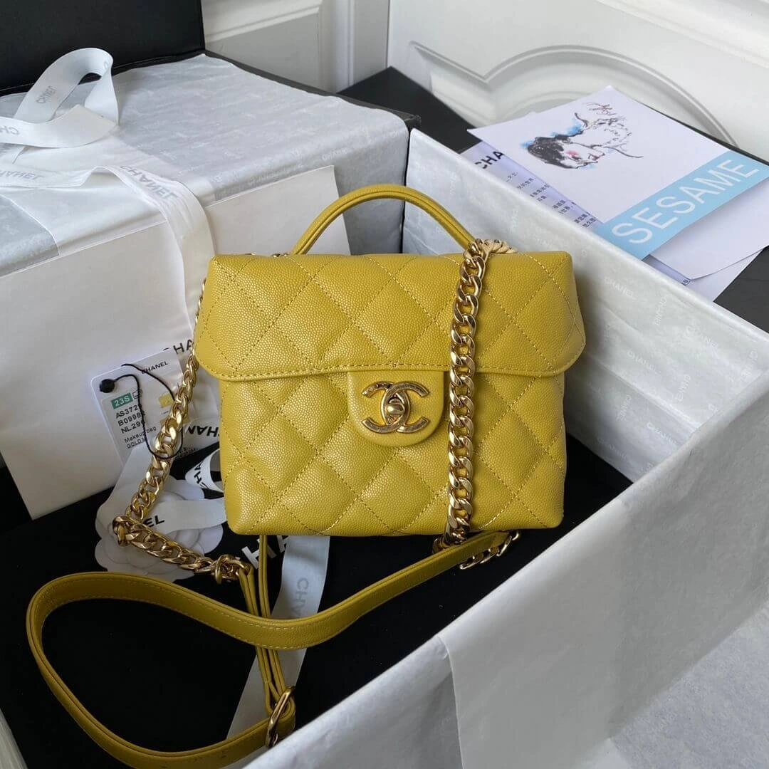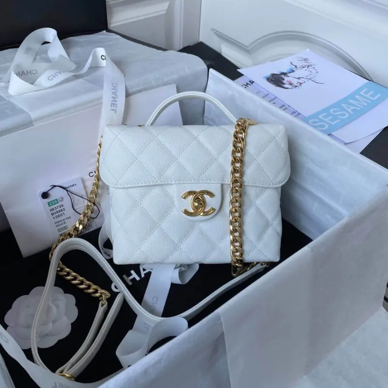 Designed for the modern wardrobe, this piece includes a sturdy top handle for a classic handheld look, along with an adjustable chain strap that allows it to be comfortably worn over the shoulder or as a chic backpack. The luxurious interior is lined with smooth lambskin, providing a soft and protective space for your essentials. A distinctive flap-over design with a secure metallic clasp completes this refined and versatile bag.