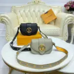 Expertly crafted from supple grained calfskin, this crossbody bag offers a relaxed yet sophisticated silhouette. Its casual shape is elevated by a polished circular emblem, adding a refined touch to the design. This handbag combines luxurious materials with everyday functionality, making it a versatile addition to any collection.
