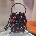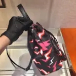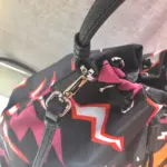 The bag’s practical design includes a secure nylon drawstring closure to keep your belongings safe, while an external zipper pocket provides quick access to essentials like your keys or phone. Finished with a distinctive triangular metal accent, this piece is a standout addition to any collection.