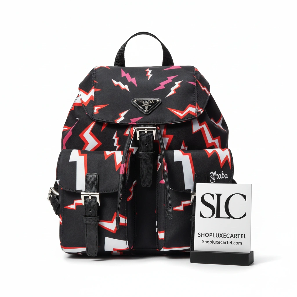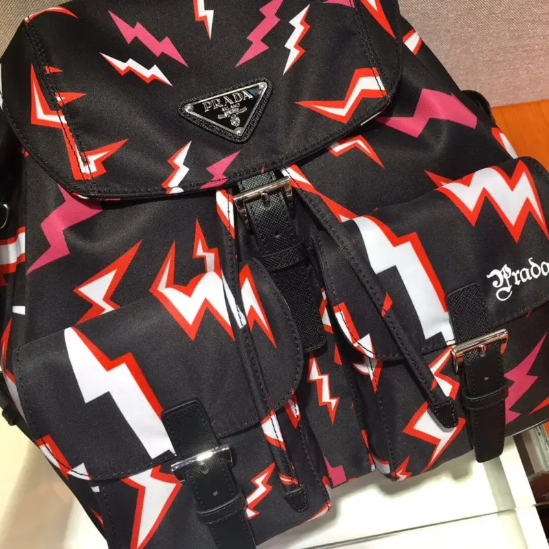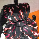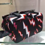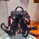Make a bold statement with this compact travel backpack, crafted from durable nylon and featuring an electrifying, all-over lightning bolt print. This bag merges eye-catching graphic design with practical functionality, enhanced by sophisticated calf leather trim and polished hardware. Its unique design is perfect for daily commutes, weekend getaways, or adding a touch of edgy style to any outfit.