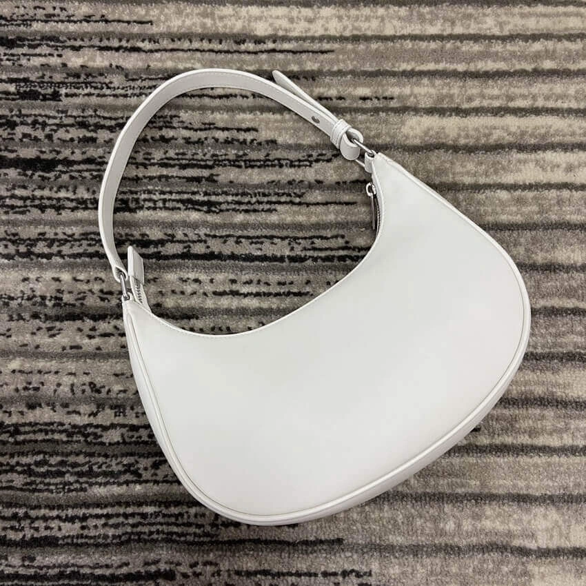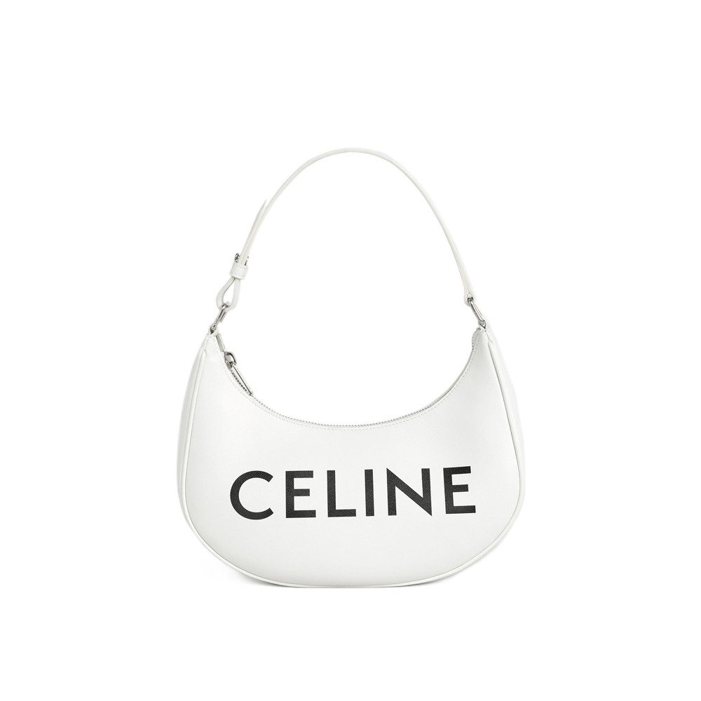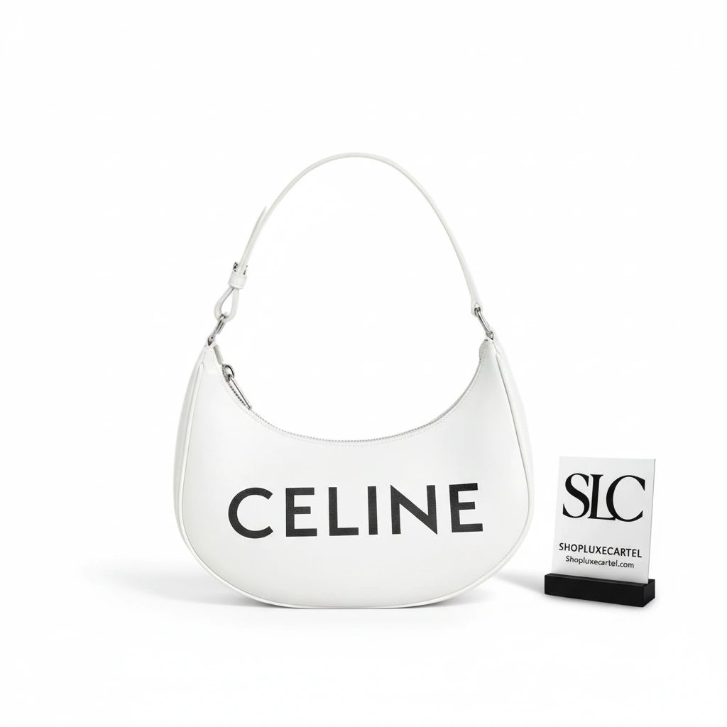 Discover a modern classic with this elegantly curved shoulder bag. Its distinct half-moon silhouette is crafted from smooth, luxurious calfskin, featuring a subtle all-over print that adds a touch of unique character. The minimalist design is both chic and versatile, making it the perfect accessory for any occasion, from casual daytime outings to sophisticated evening events.