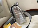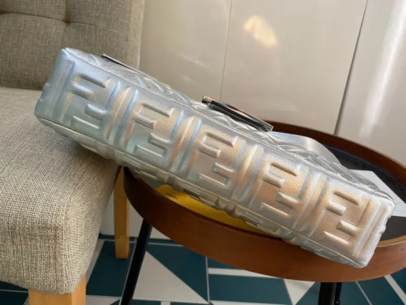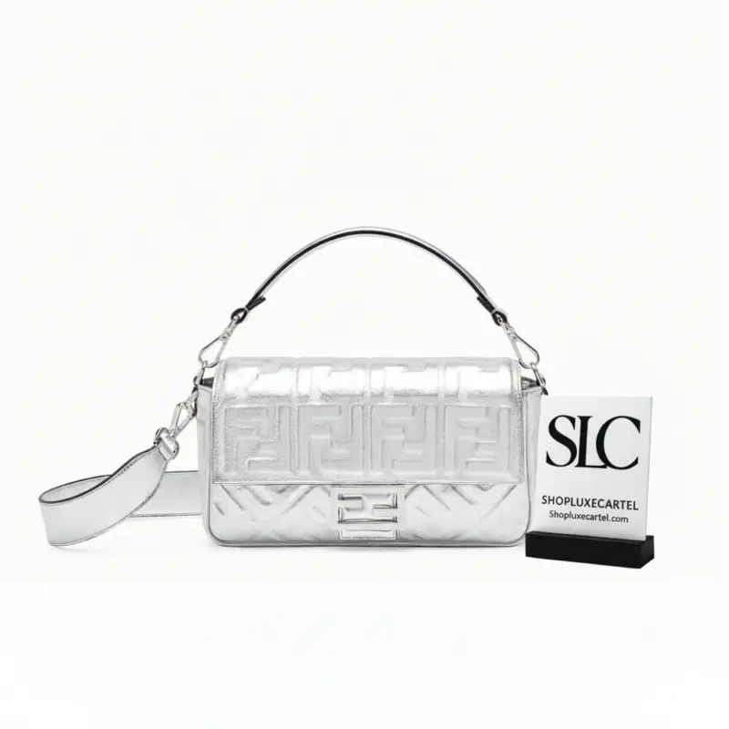 A true statement piece, this classic baguette-style bag is crafted from luxurious calfskin leather with a brilliant mirror-effect silver finish. Its timeless silhouette is enhanced with an elegant embossed geometric motif throughout. The versatile design makes it the perfect accessory for both day and evening wear, adding a touch of glamour to any outfit.