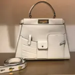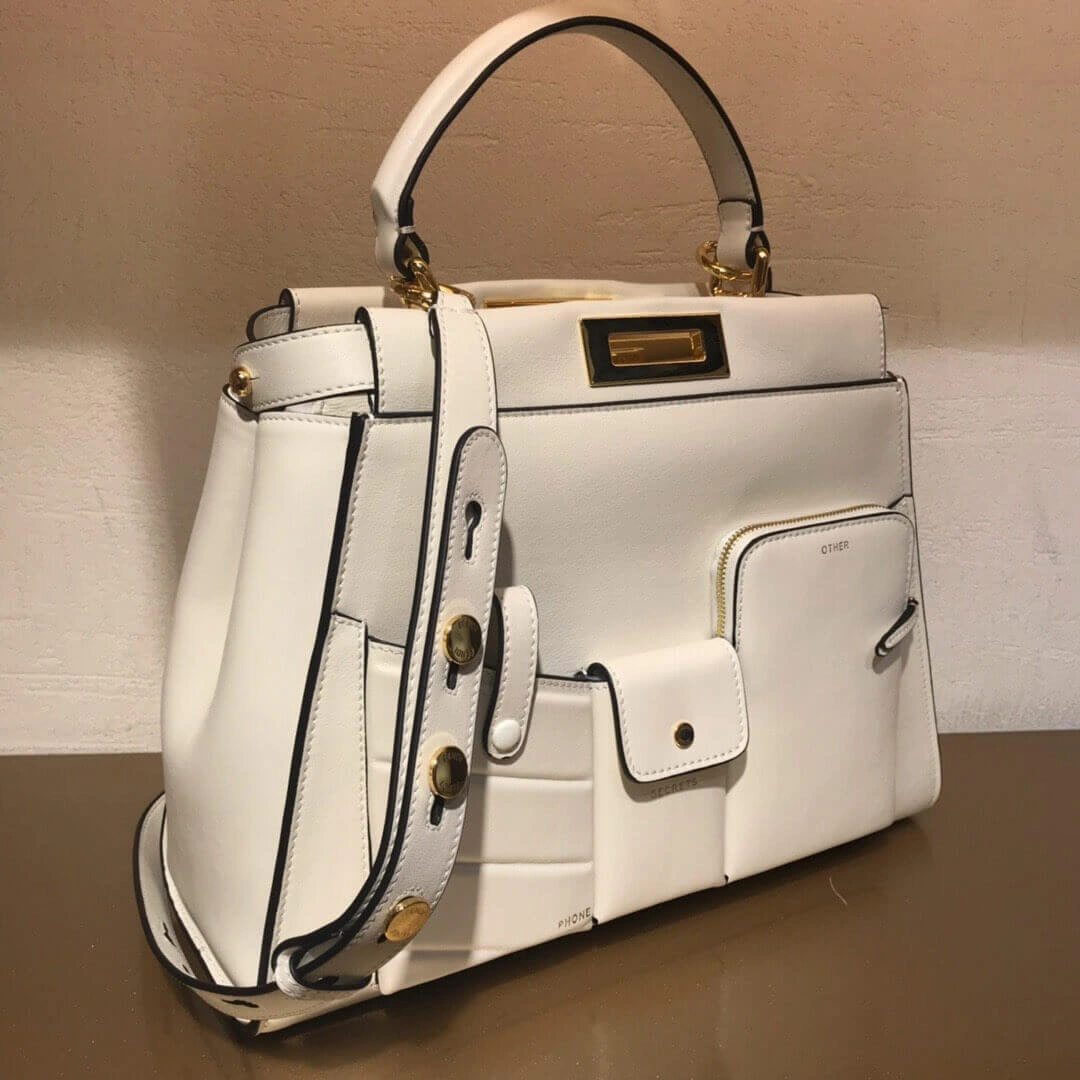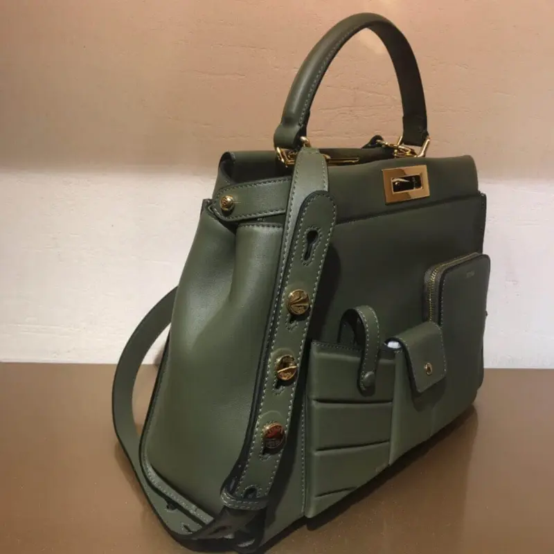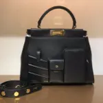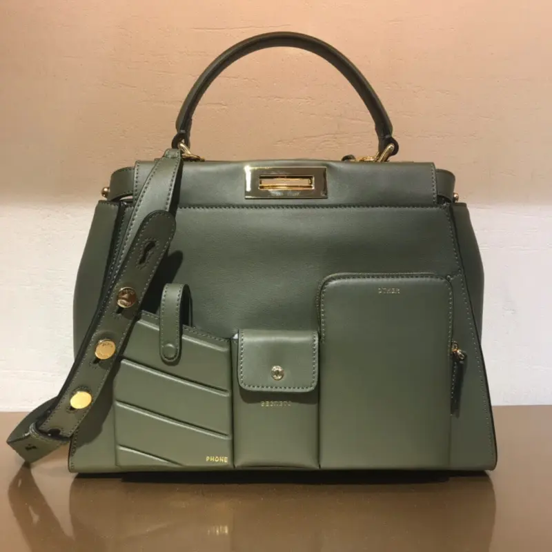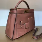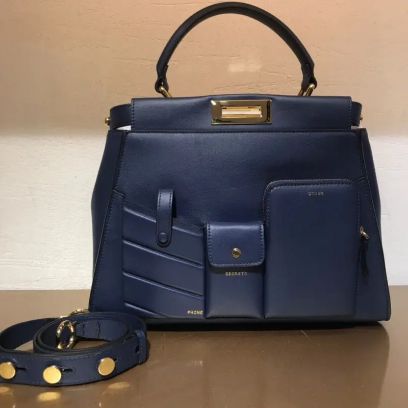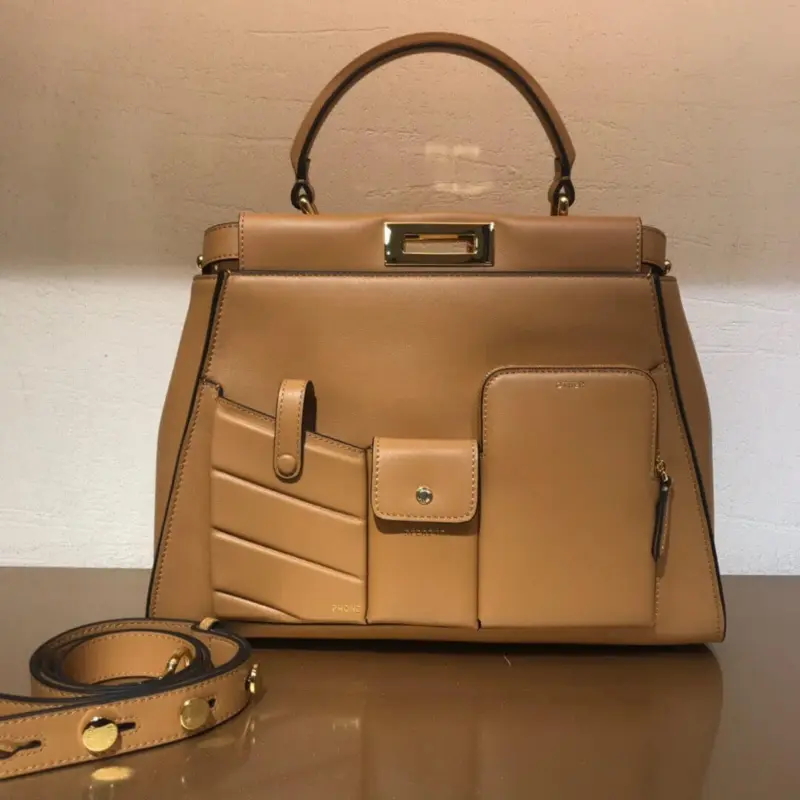 Designed for modern versatility, this medium-sized handbag includes three exterior pockets of varying sizes for quick-access storage. It can be carried gracefully by its single top handle or worn comfortably over the shoulder or crossbody using the adjustable and detachable strap, making it the perfect companion for any occasion.