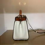 The bag features a distinctive dual-compartment interior, secured with a classic twist-lock on each side. A sturdy top handle and a detachable, adjustable shoulder strap provide versatile carrying options, allowing it to effortlessly transition from a chic handbag to a comfortable crossbody.