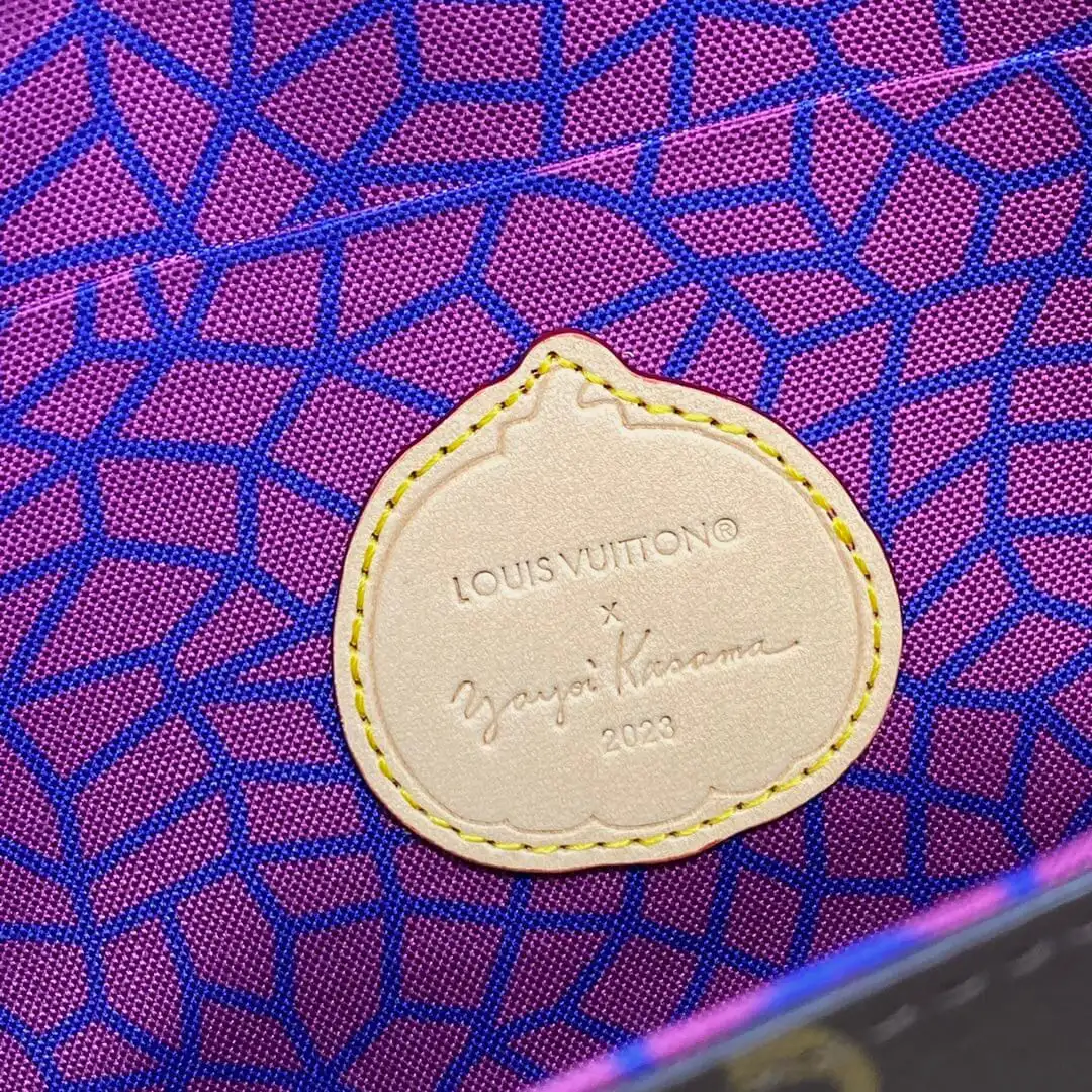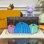 Infused with creative charm, this stylish pochette showcases a vibrant and artistic pumpkin dot print set against a classic geometric patterned canvas. This piece offers exceptional functionality and versatile styling options. It can be carried as a chic clutch or worn as a crossbody bag using its elegant, detachable chain strap.