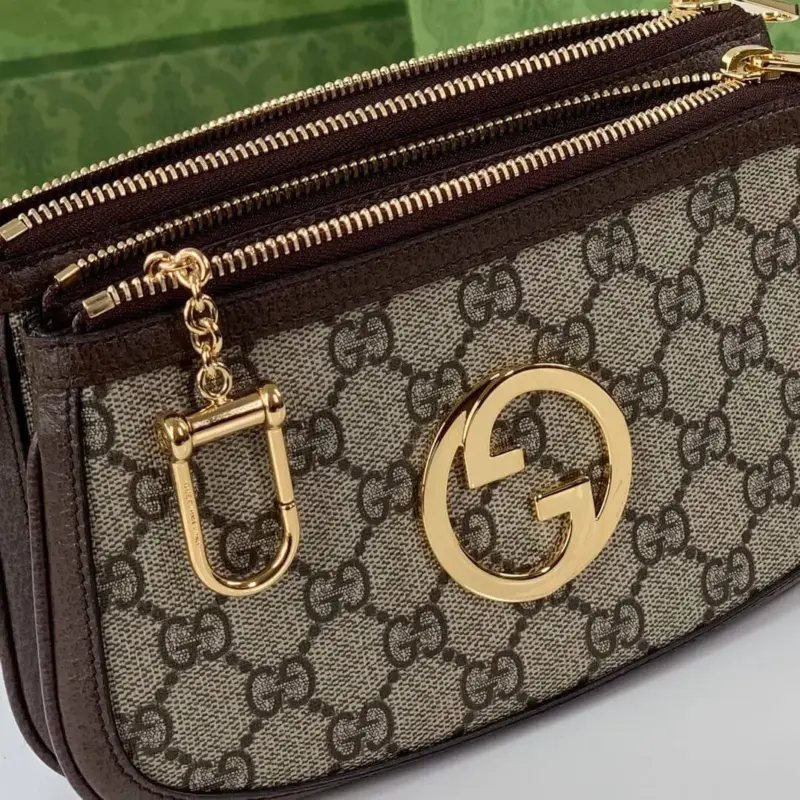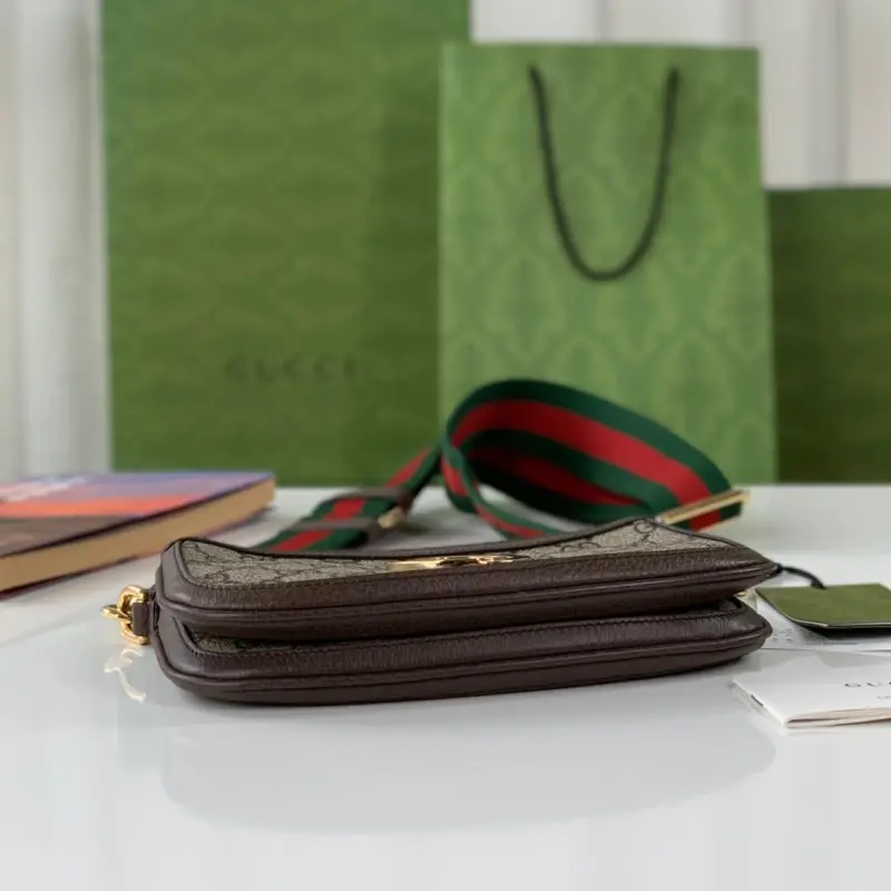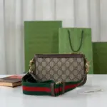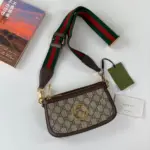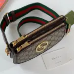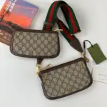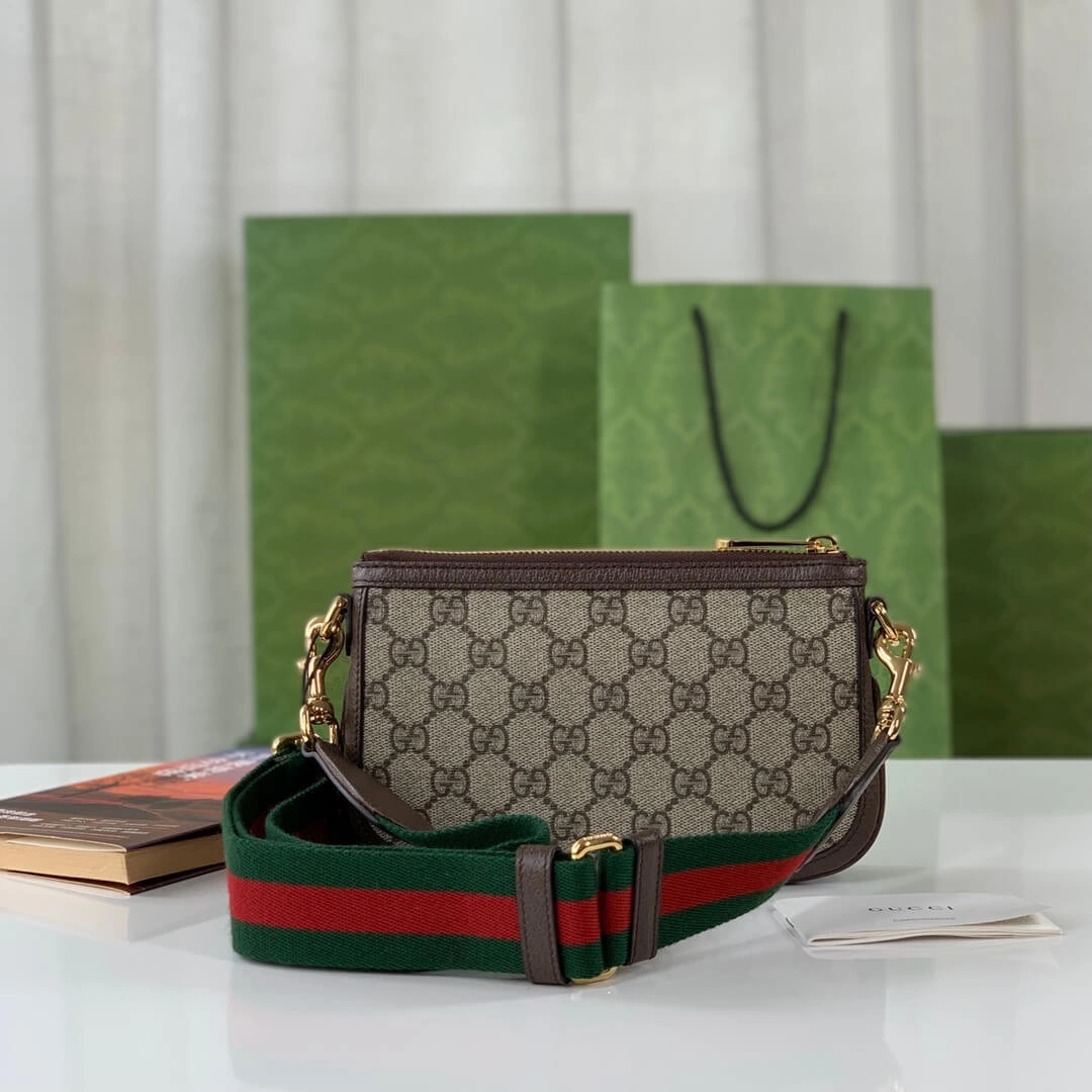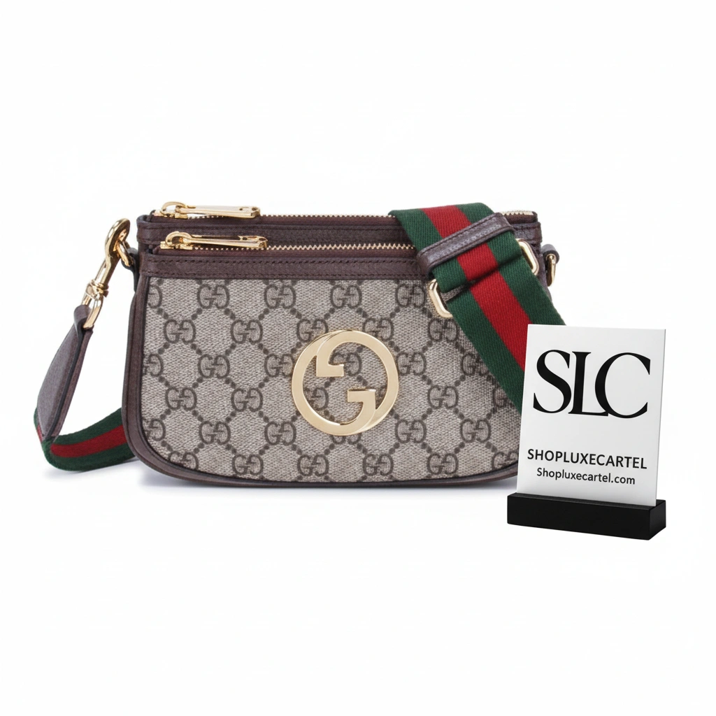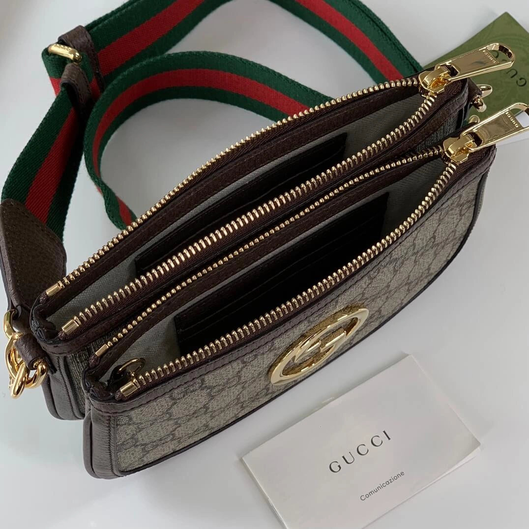 The bag is distinguished by a vibrant, detachable shoulder strap with a signature green and red stripe detail, offering multiple ways to wear it. A circular emblem with interlocking letters adorns the front, providing a refined focal point. The secure zip closure opens to a moiré-lined interior, thoughtfully designed with card slots for optimal organization.