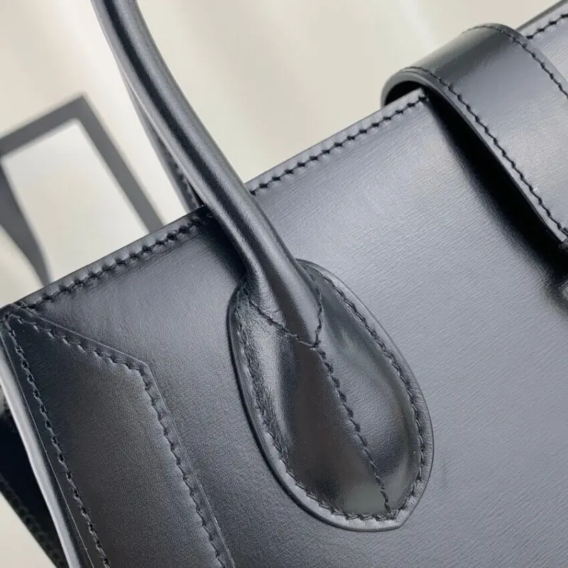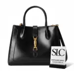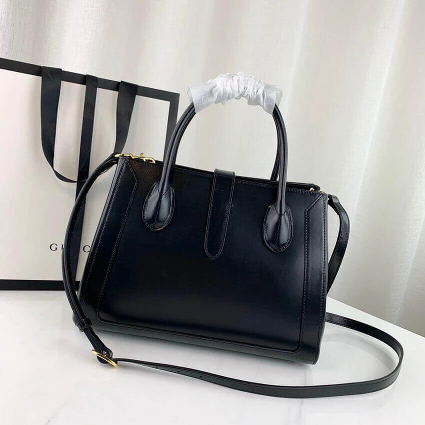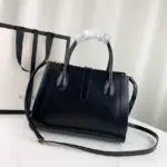 Discover a timeless silhouette with this beautifully crafted medium tote bag. Designed for versatility, it features both top handles and a detachable shoulder strap, allowing it to be carried in multiple ways to suit any occasion. The supple black leather is elegantly contrasted by polished, gold-toned hardware, creating a look of classic sophistication.