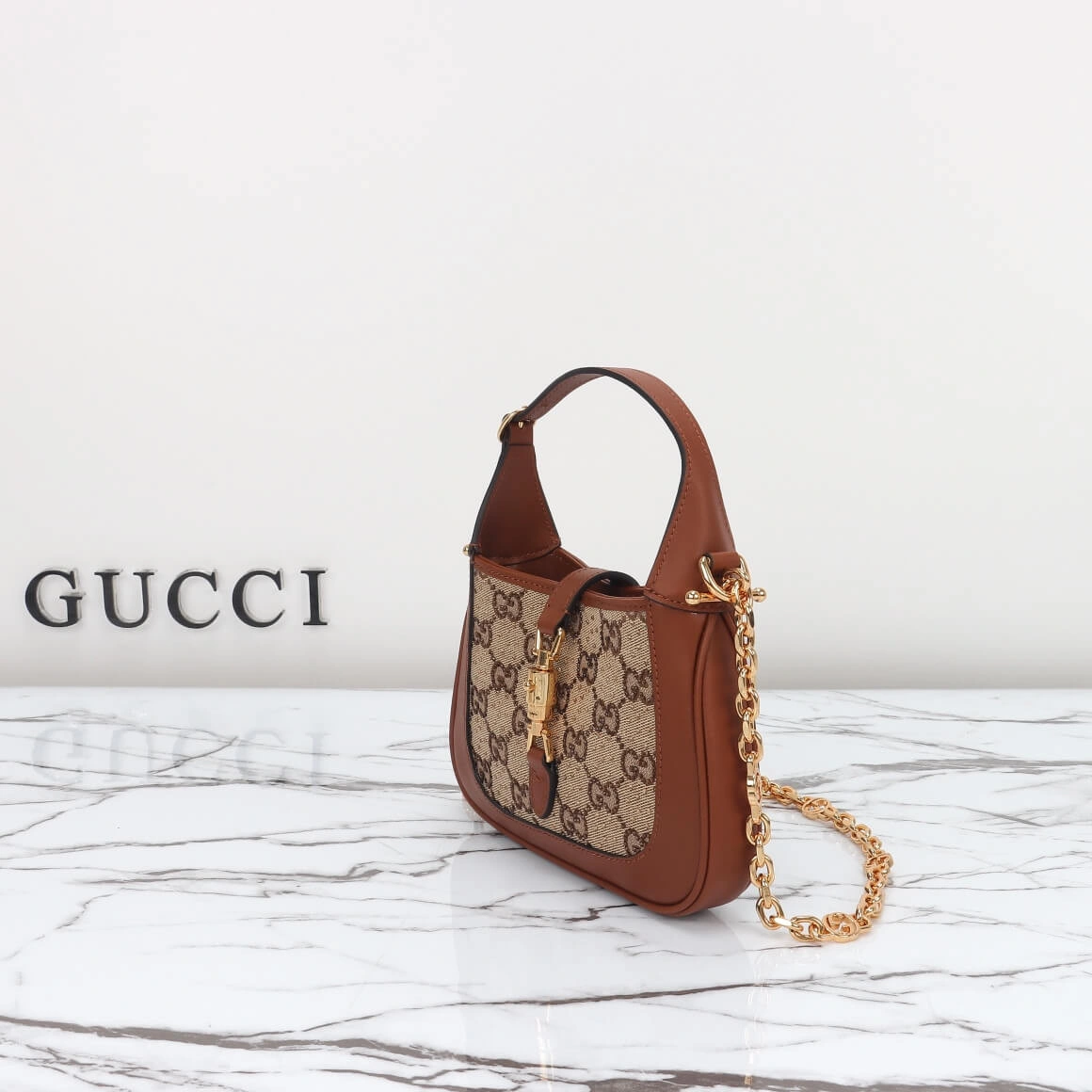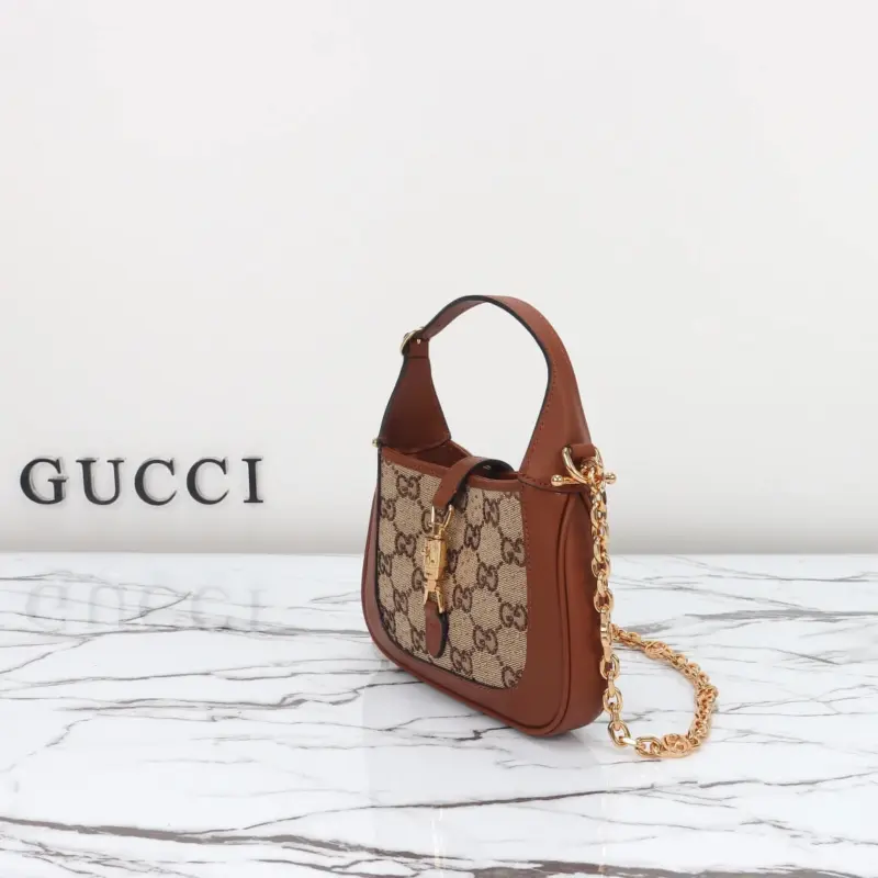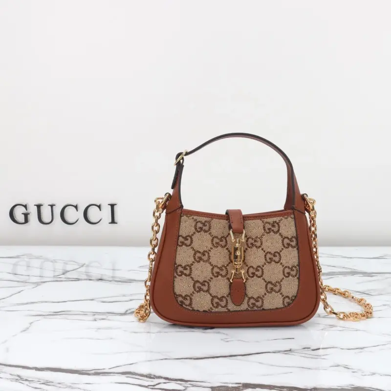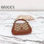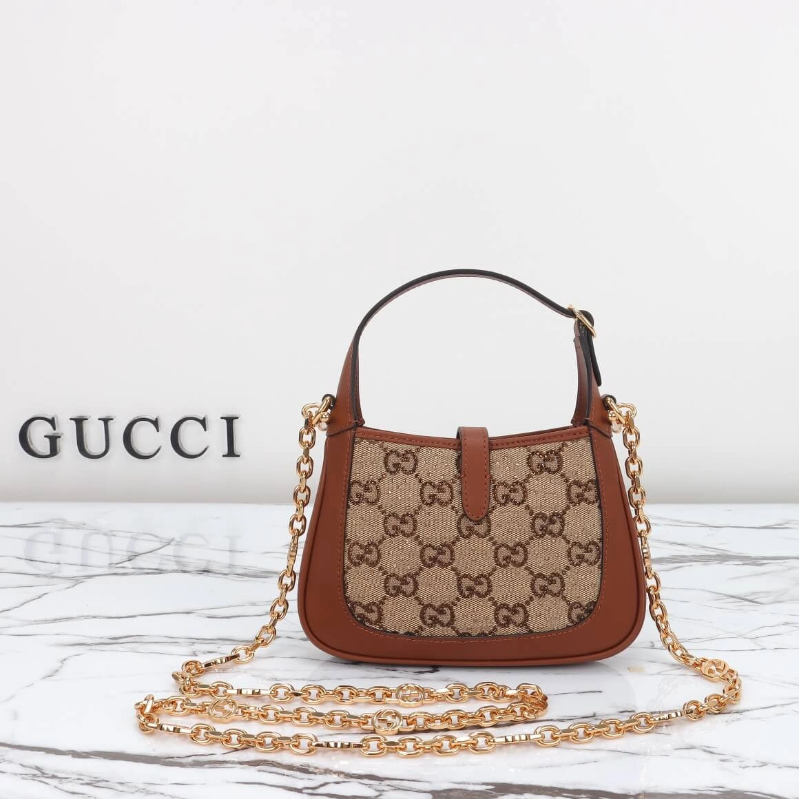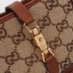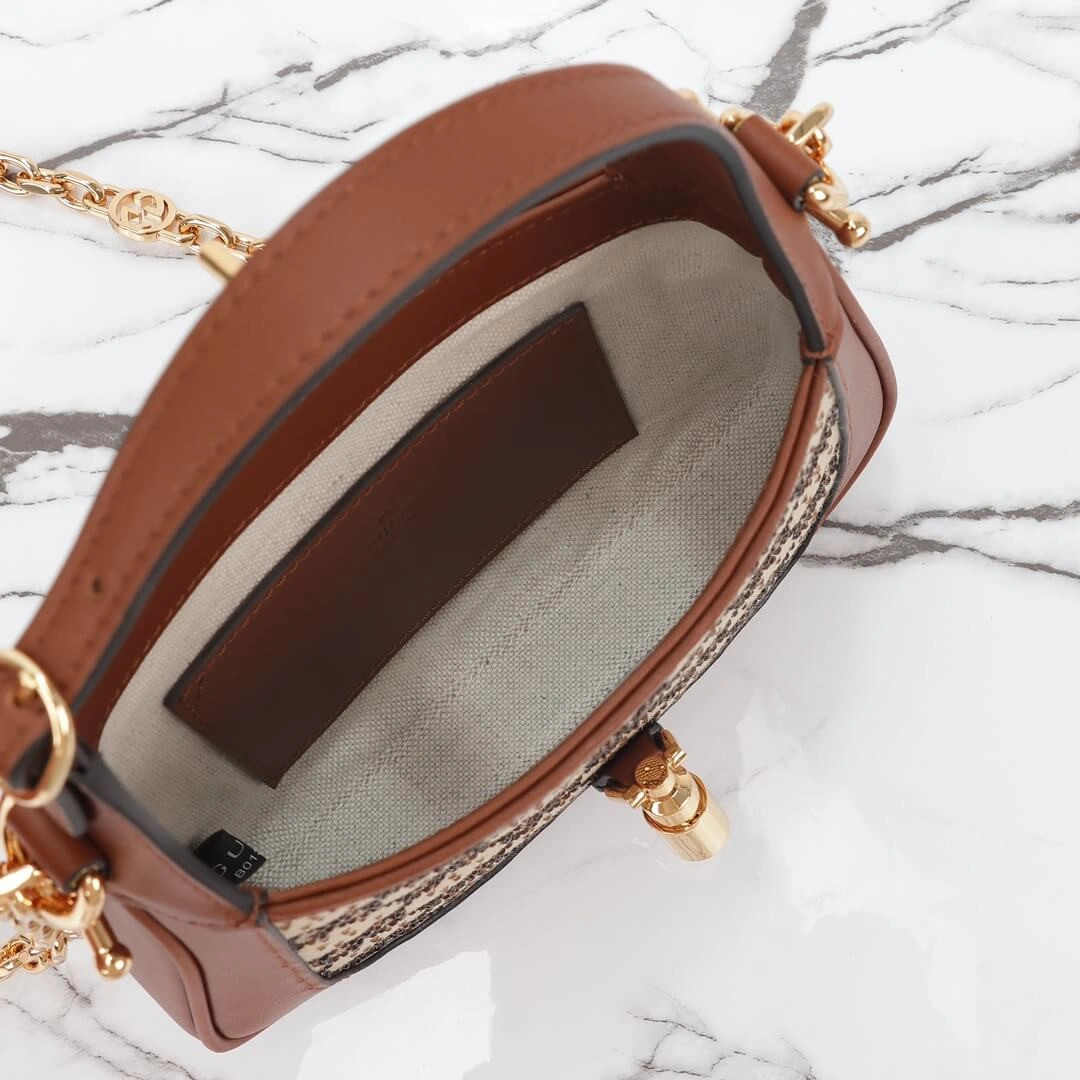 The bag’s compact shape is complemented by rich leather trim and gleaming hardware, making it an eclectic and stylish choice for any occasion. Its distinctive closure adds a final touch of heritage-inspired elegance.