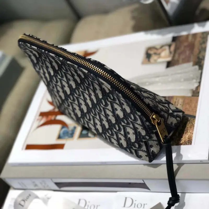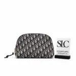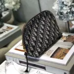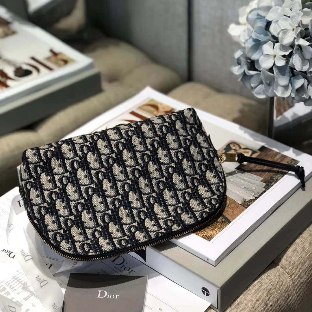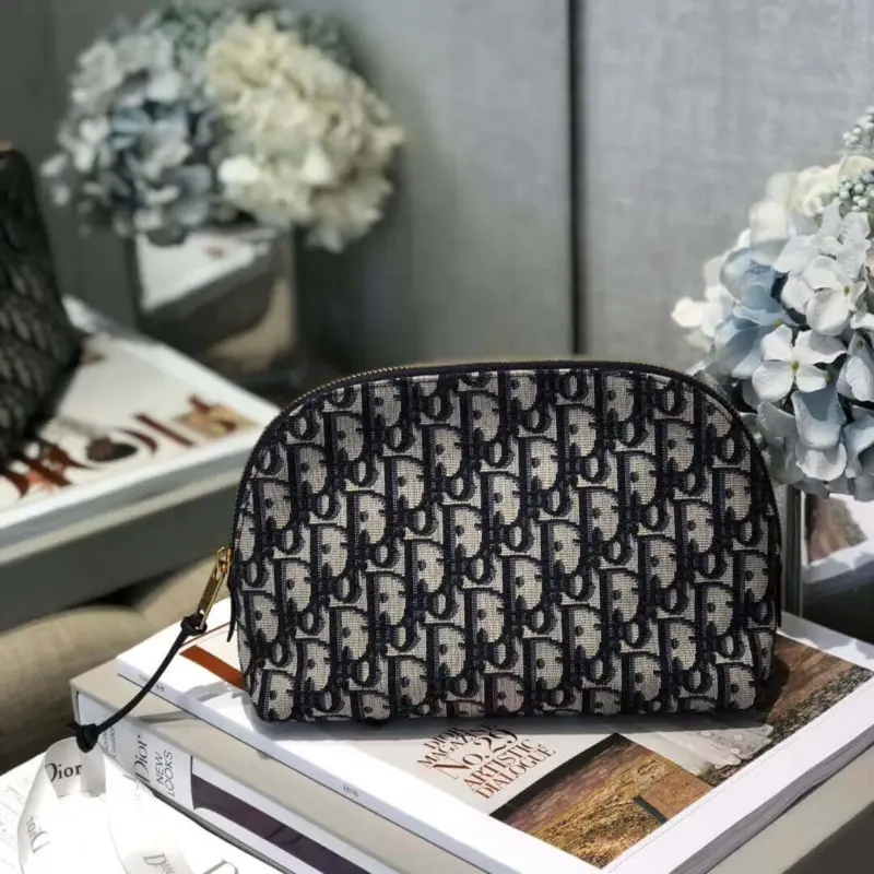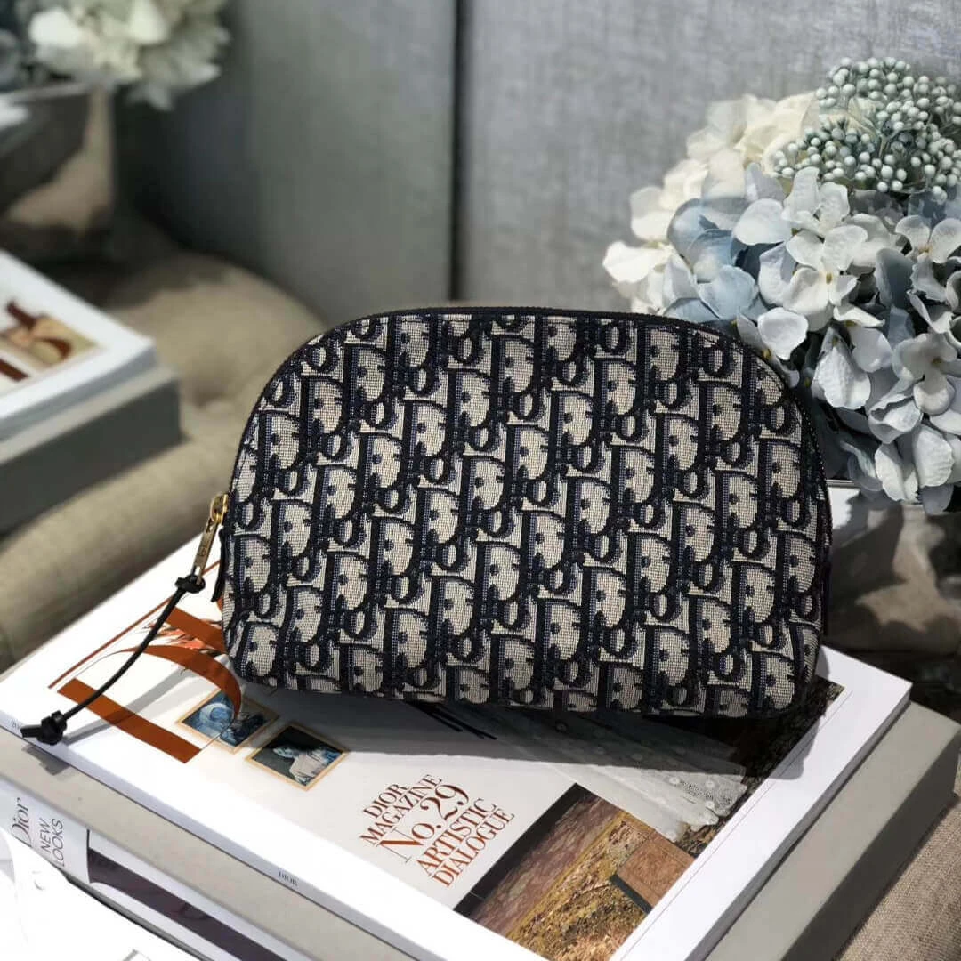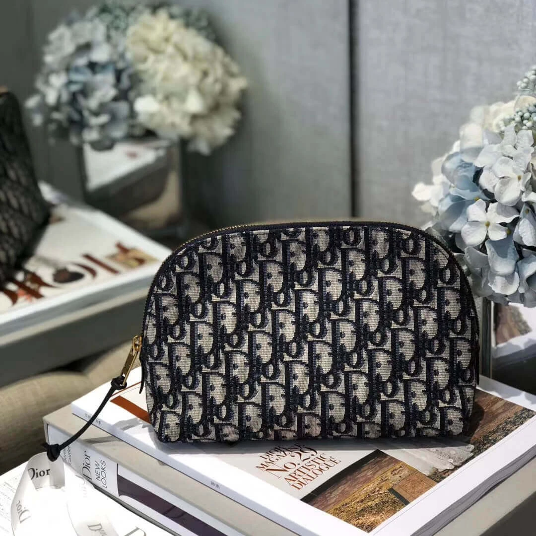 Keep your beauty essentials organized with this beautifully crafted travel vanity case. Constructed from a durable jacquard canvas in a deep blue hue, this bag features an elegant, repeating monogram pattern for a touch of classic sophistication. The design is elevated by rich blue calfskin leather details, creating a refined and timeless aesthetic perfect for any journey.