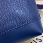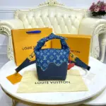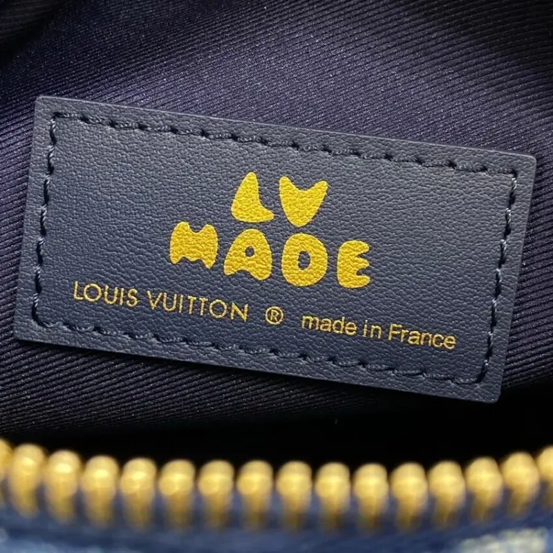 Discover a truly unique accessory that blends contemporary street-style aesthetics with traditional Japanese-inspired design. This fashionable city bag showcases a captivating dual-material construction, featuring a wave of blue geometric print denim flowing over a body of sumptuous navy blue grained leather. Its compact yet spacious interior is perfect for holding all your everyday essentials, making it as functional as it is stylish.