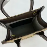 This mini tote bag showcases a classic design elevated by a contemporary, oversized monogram print. The distinctive camel and ebony canvas is framed by rich brown leather trim, offering a sophisticated and timeless appeal. Its structured silhouette makes it a versatile accessory for both day and evening ensembles.