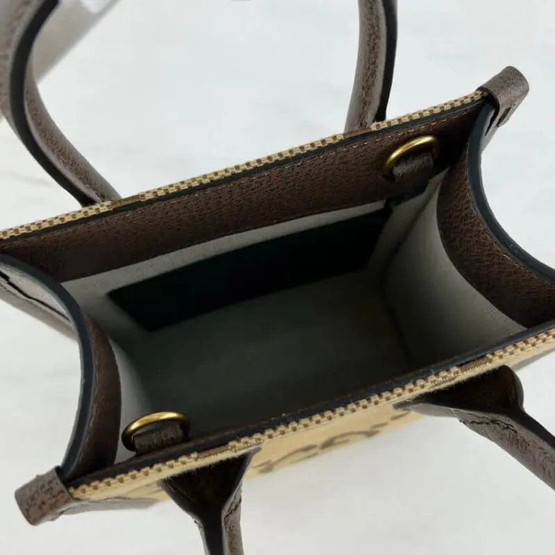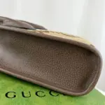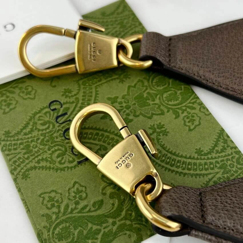 Functionality meets iconic style with dual carrying options. The bag features comfortable top handles and a detachable shoulder strap for crossbody or shoulder wear. A vibrant green and red striped webbing detail adds a touch of recognizable flair, completing this compact and elegant piece.