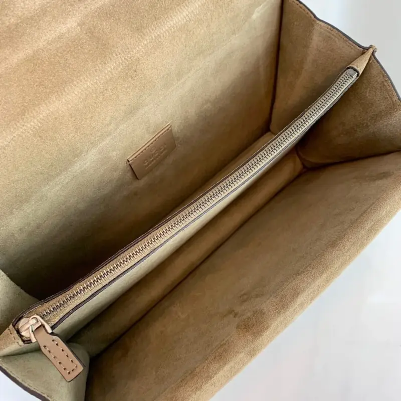 - Interior: Features a zippered compartment and an open pocket under the flap