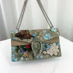 Discover a beautifully crafted shoulder bag that combines classic design with enchanting, nature-inspired details. This piece is constructed from a durable coated canvas, featuring an intricate embroidery of bees and flowers that adds a touch of whimsical elegance. The structured silhouette is complemented by sleek, silver-toned hardware and a unique, crystal-accented closure, making it a sophisticated choice for any occasion.