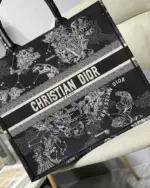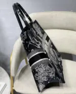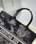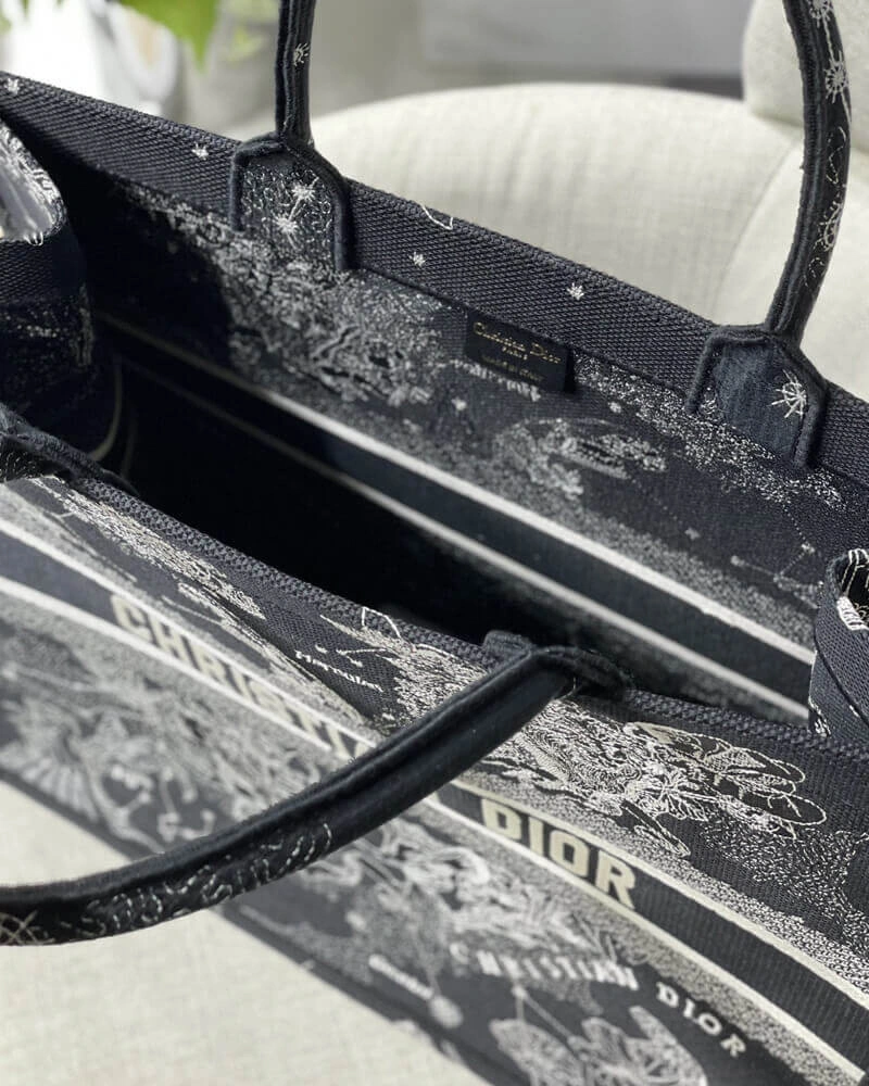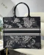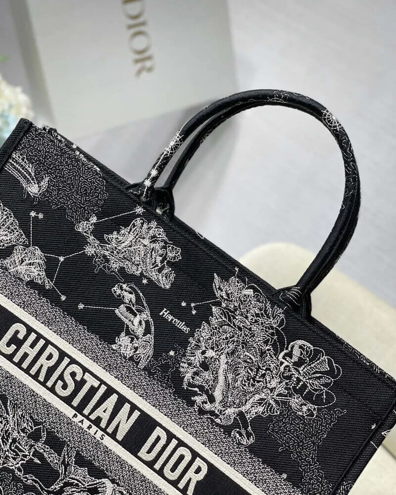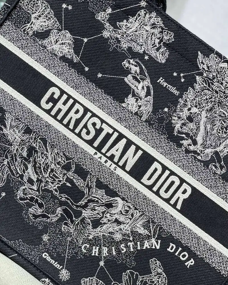 Showcasing exquisite, full embroidery, this large tote bag is designed to hold all your daily necessities in style. The captivating design features a classic black Toile de Jouy pattern, intricately woven with a Zodiac motif that pays homage to a fascination with astrology. This tote is a perfect example of fine craftsmanship and timeless appeal.