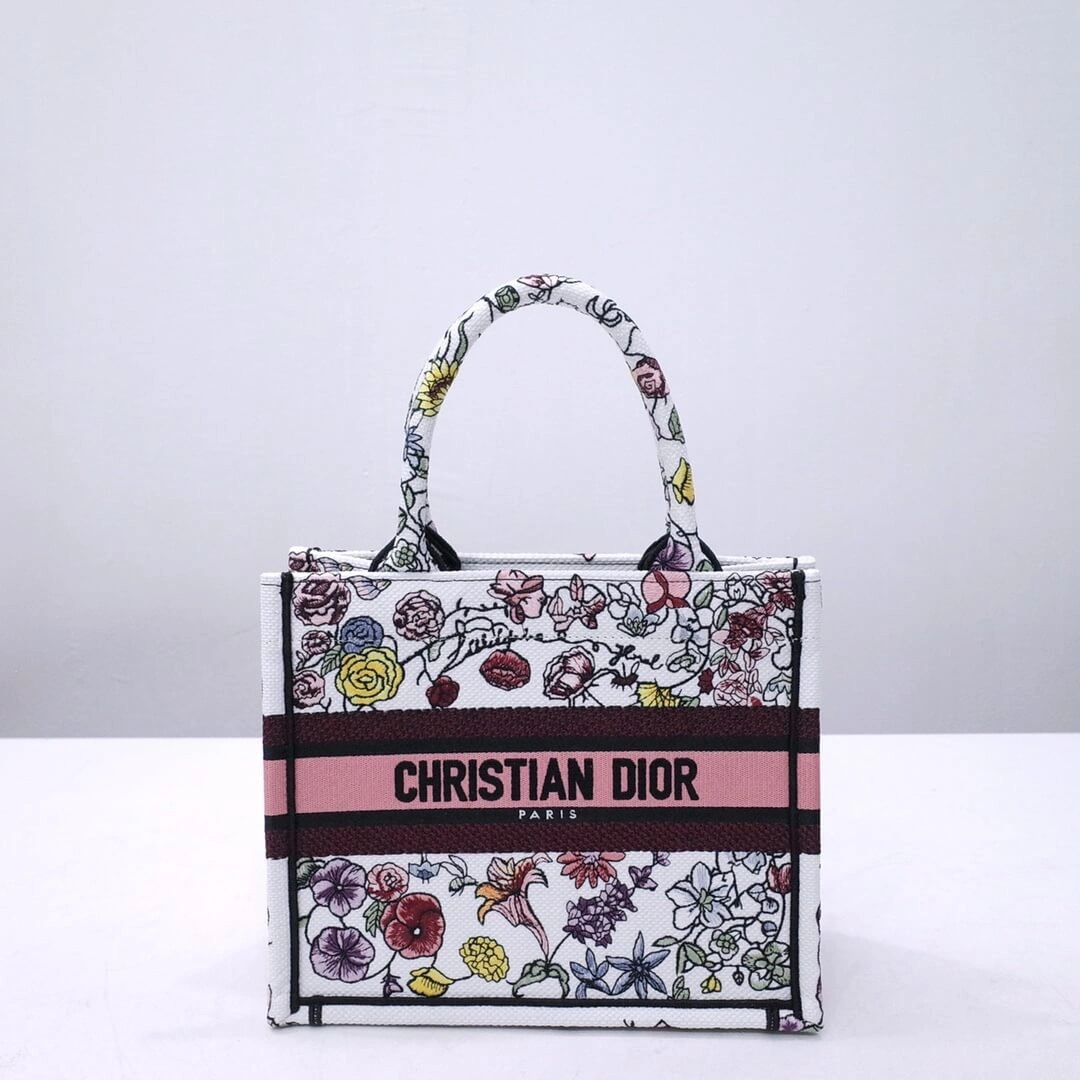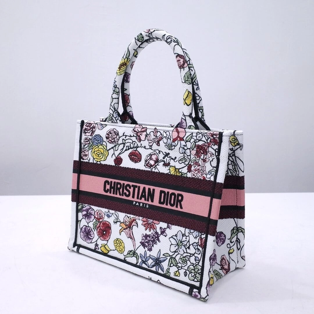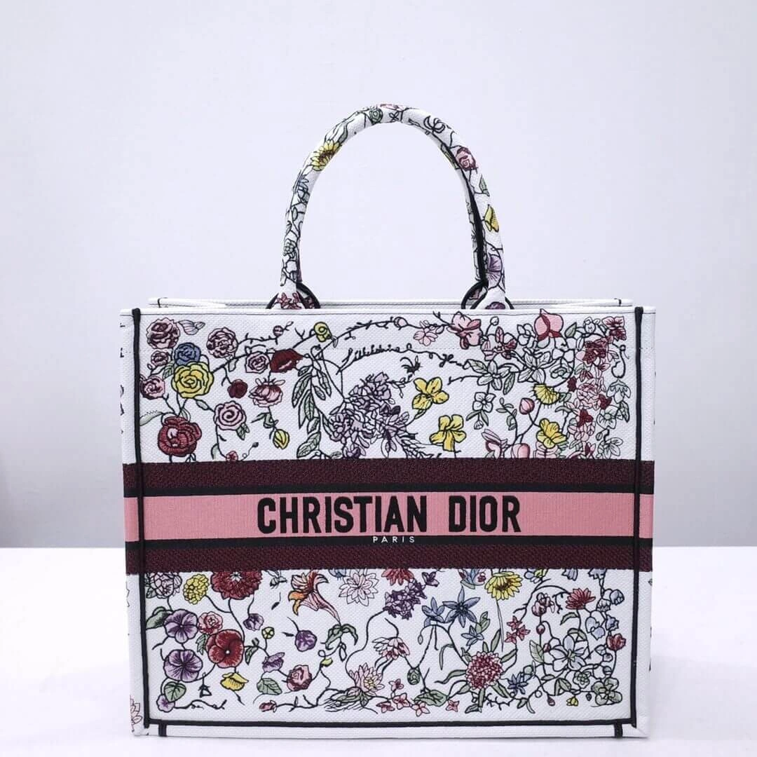 Showcasing an elegant and colorful universe, this beautifully crafted tote bag is the perfect statement piece for any wardrobe. The entire bag is covered in a lush, multicolor floral embroidery on a crisp white canvas background, creating a sophisticated and bucolic charm. Its structured design offers a refined yet practical silhouette.