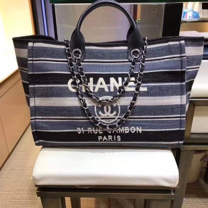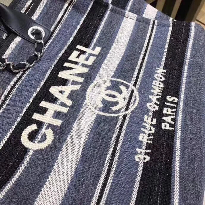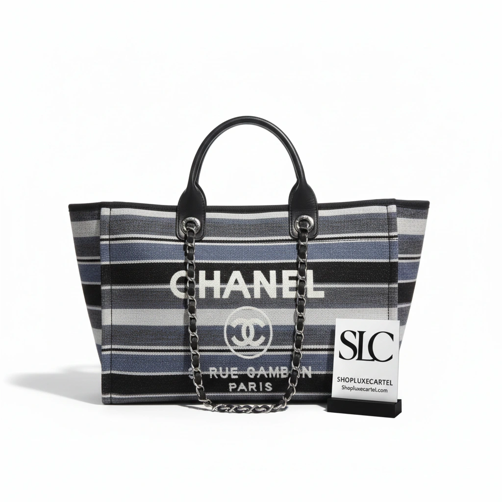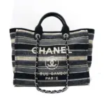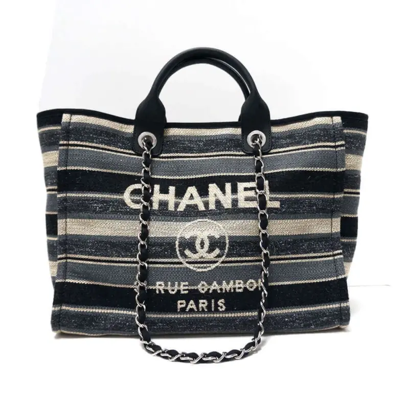 Crafted from a durable tweed canvas, this tote is accented with fine calfskin trim and polished silver-tone hardware. It features both comfortable top handles and stylish shoulder straps made with an interwoven chain and leather design for multiple carrying options. The front is adorned with prominent lettering that reads “31 Rue Cambon Paris,” adding a touch of classic Parisian flair.