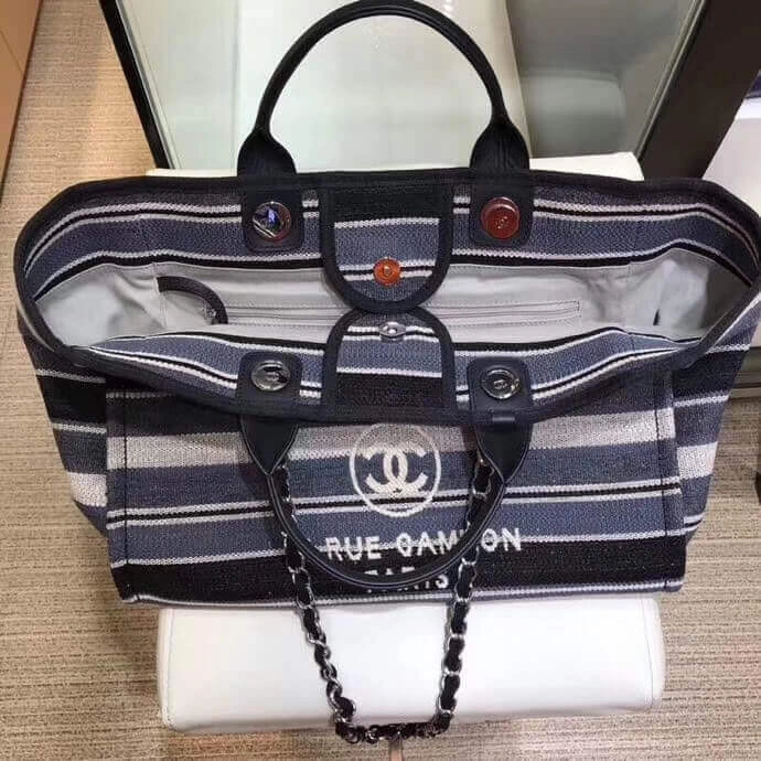 Large Deauville Black Grey Striped Tweed Shopper Tote A66941