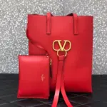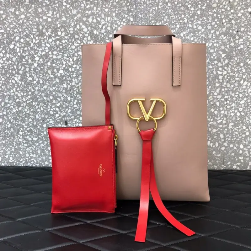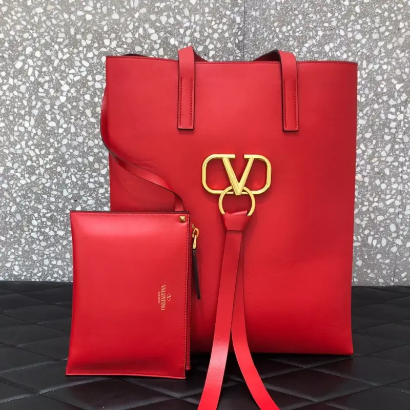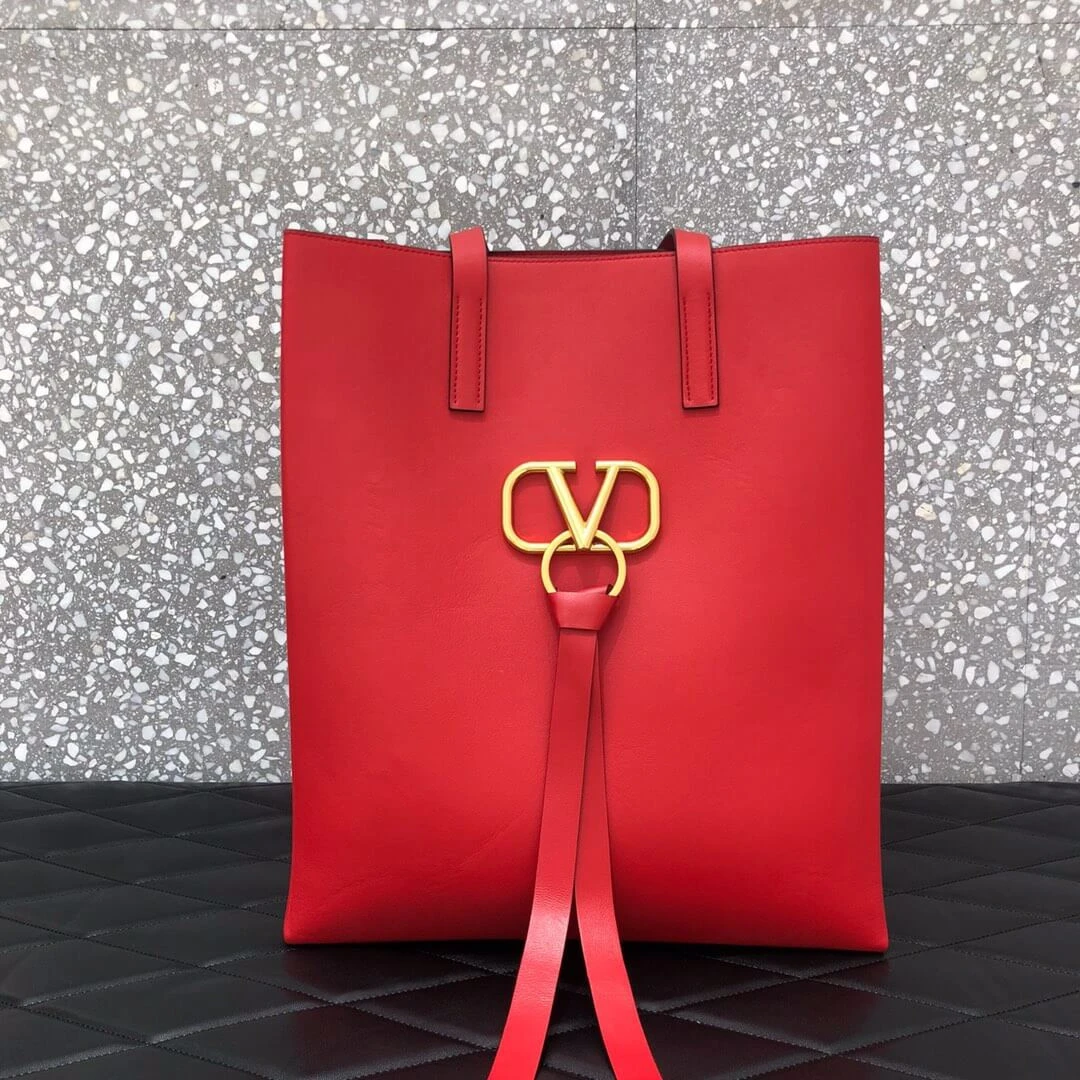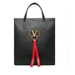 The tote is defined by its distinctive hardware detail—a polished, V-shaped metal ring accented with a delicate leather tie. Lined with smooth Nappa leather, the interior includes a convenient separate pouch to keep smaller items organized. The hardware’s antique-brass finish provides a touch of vintage-inspired charm to this modern classic.
