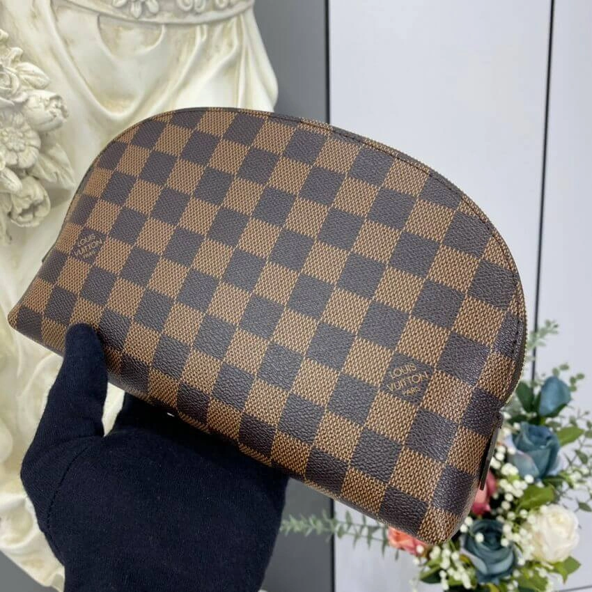 Keep your beauty essentials organized in timeless style with this luxurious and spacious cosmetic pouch. Its elegant design and structured shape make it a perfect accessory for travel or for adding a touch of sophistication to your vanity. Crafted from a durable coated canvas with a classic checkerboard pattern, this pouch combines enduring style with practical functionality.