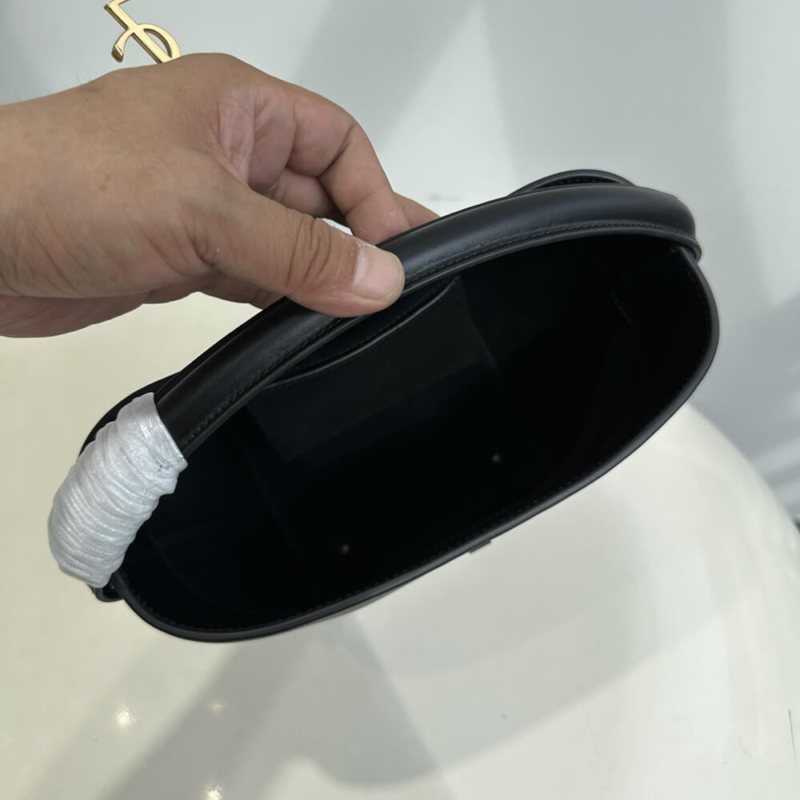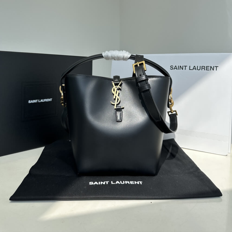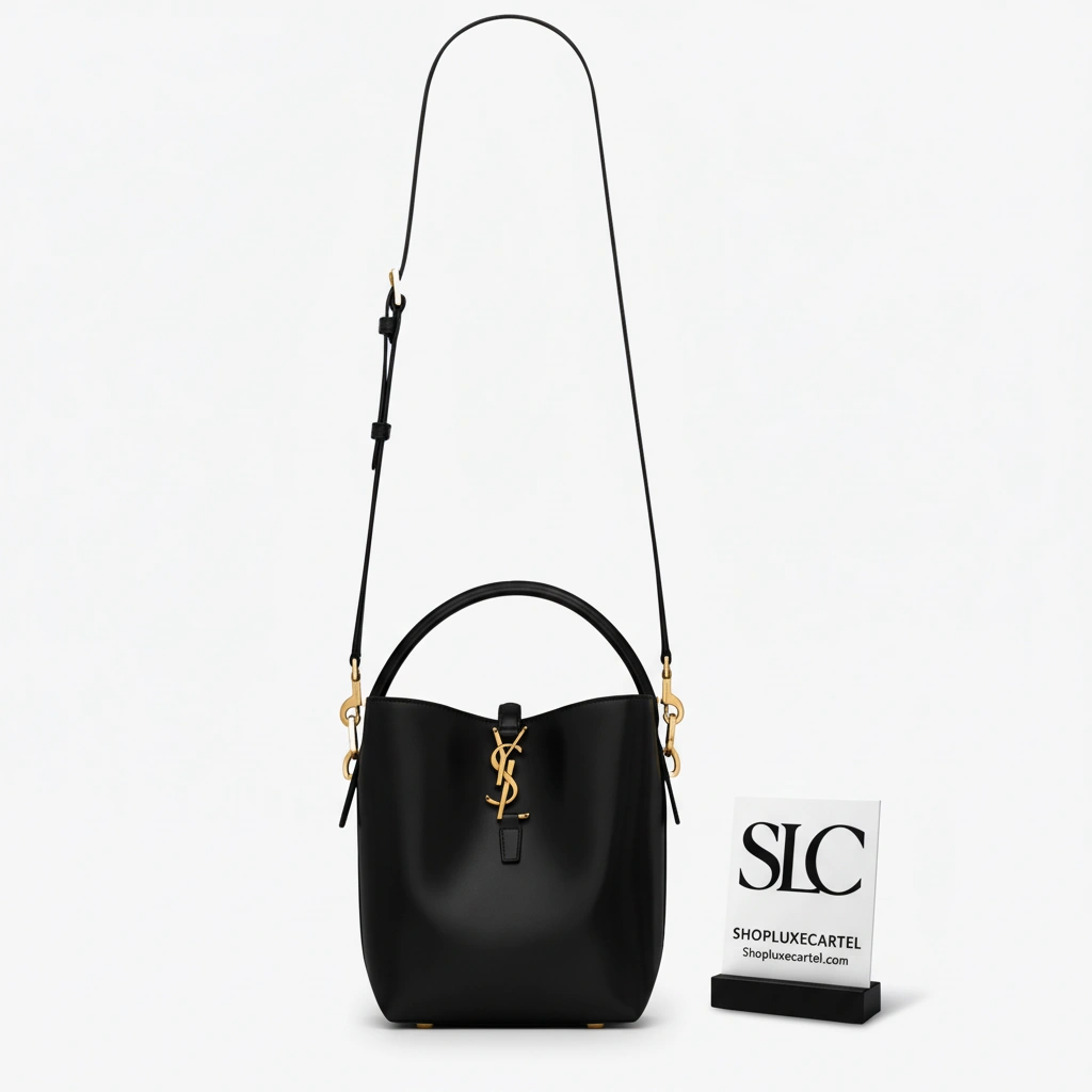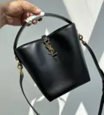 Discover a modern classic with this beautifully structured bucket bag, expertly crafted from supple calfskin leather. Its clean lines and compact, upright silhouette create a sophisticated look that transitions effortlessly from day to evening. The bag’s elegant design is complemented by a distinctive metal hook closure that adds a touch of polished detail while securing your belongings.
