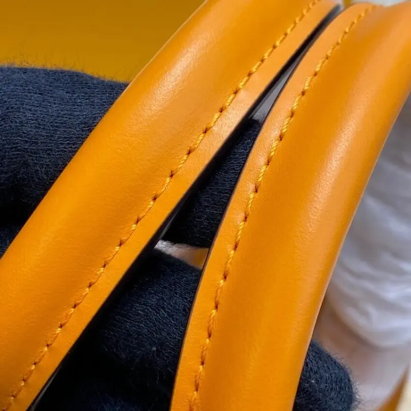 Discover your new essential accessory with this beautifully crafted top handle tote. Made from supple, smooth calf leather, this bag offers a sophisticated structure and a vibrant orange hue that adds a pop of color to any outfit. The side panels feature an intricate perforated pattern, lending a unique and subtle elegance to the design. Its versatile size makes it perfect for both daily errands and special occasions, providing ample storage without being cumbersome.