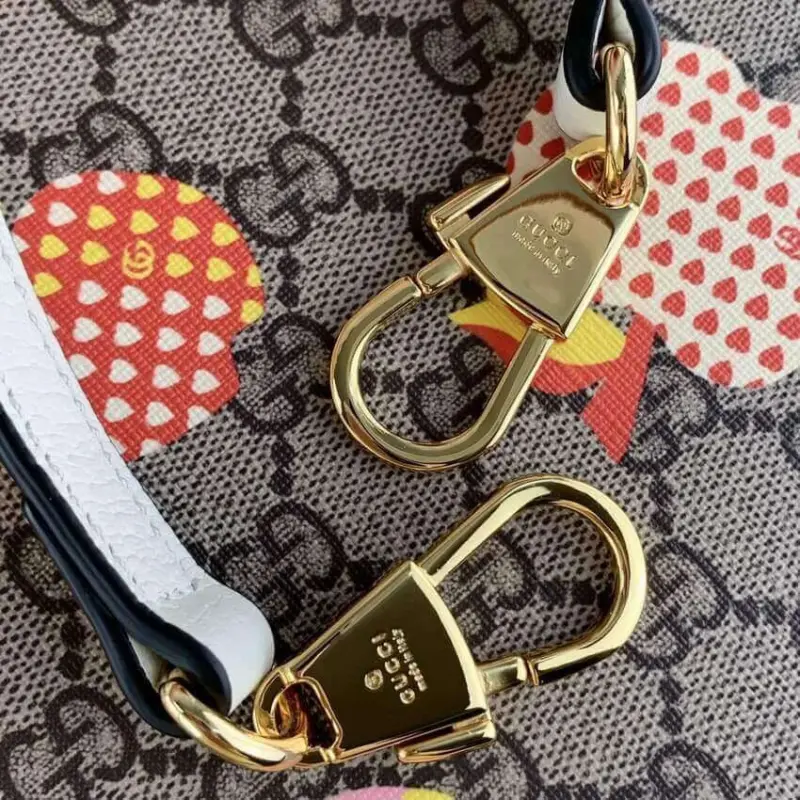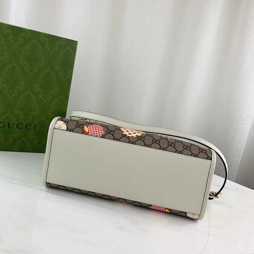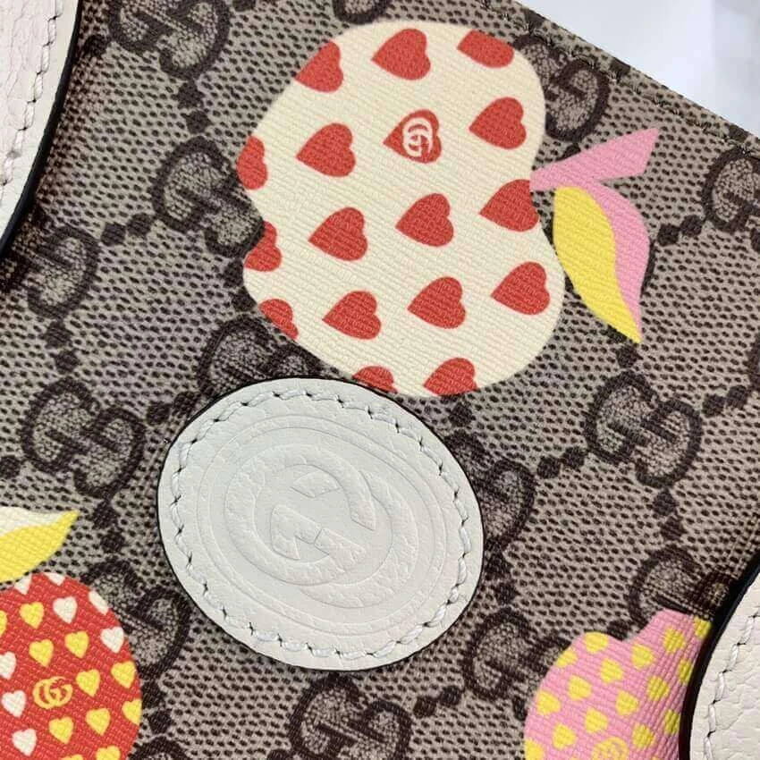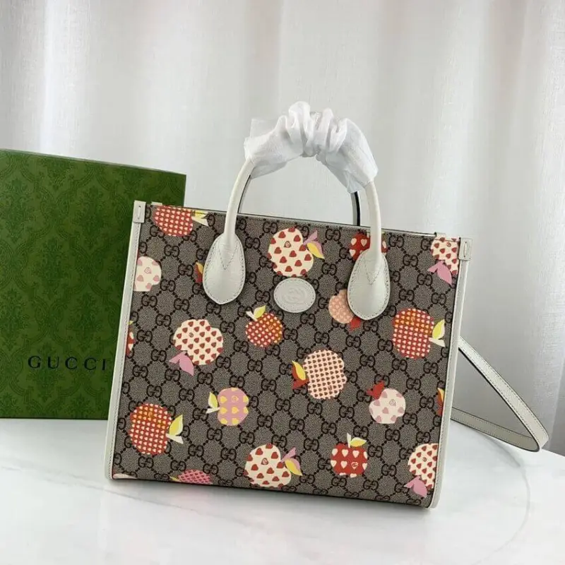 Embrace a spirit of playful charm with this beautifully crafted small tote bag. Featuring a whimsical apple and heart motif set against a classic geometric-print canvas, this bag is designed to add a touch of personality and color to any ensemble. The durable coated canvas is accented with crisp white leather trim, creating a fresh and contemporary look that is both stylish and versatile.