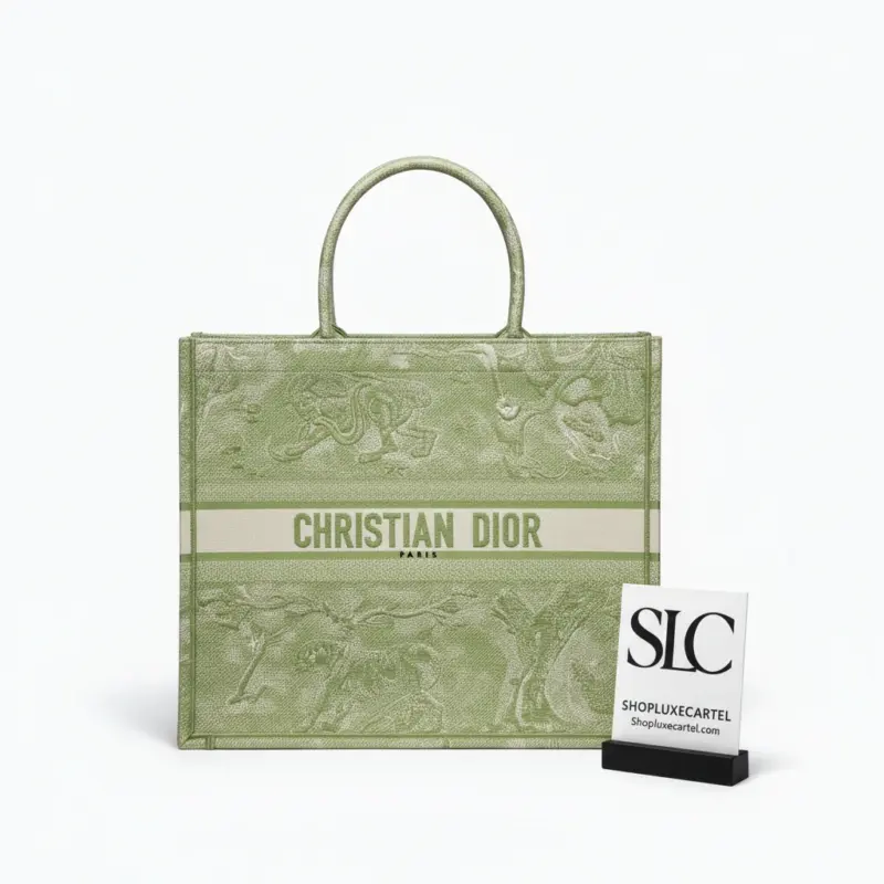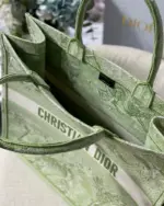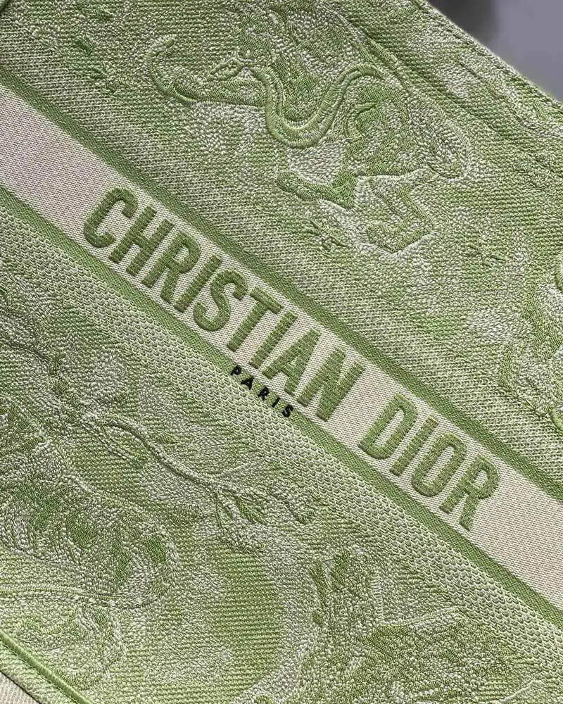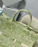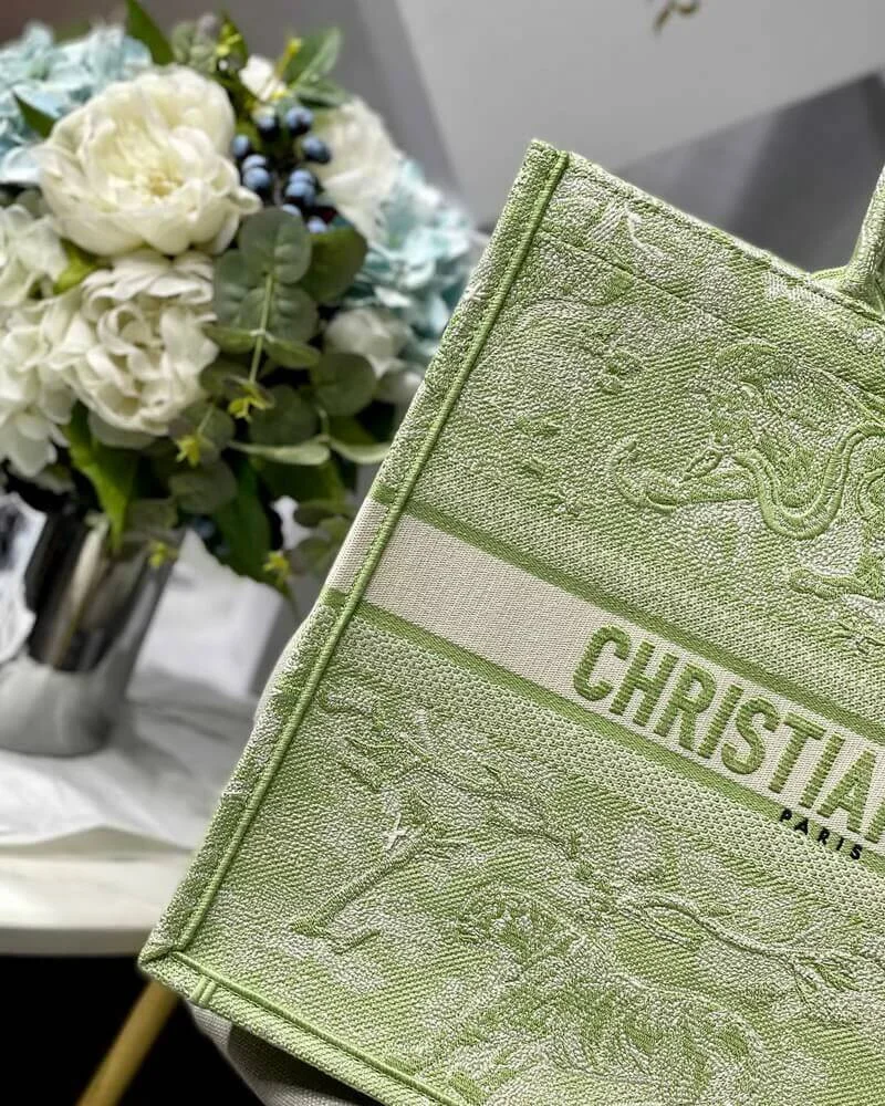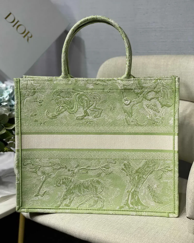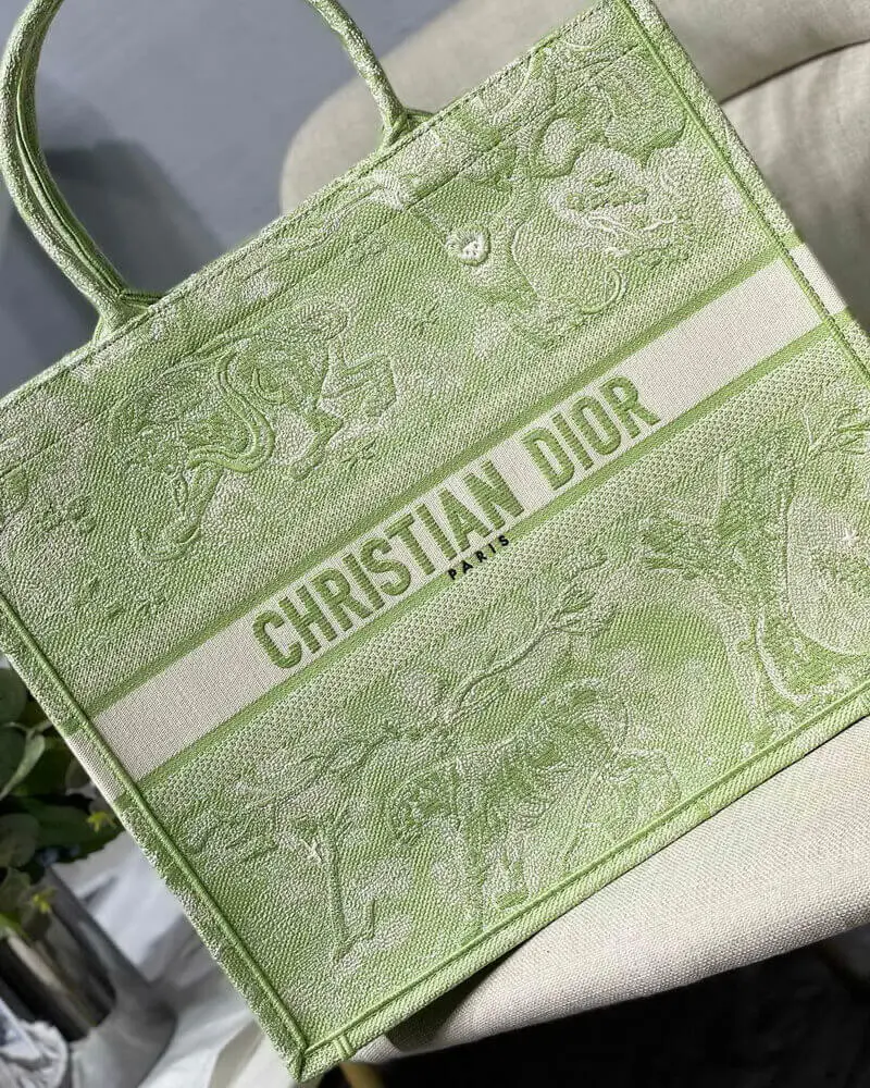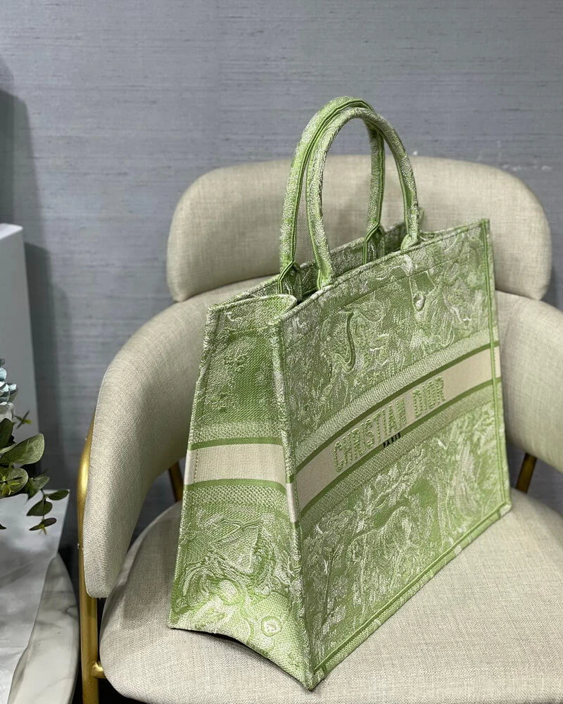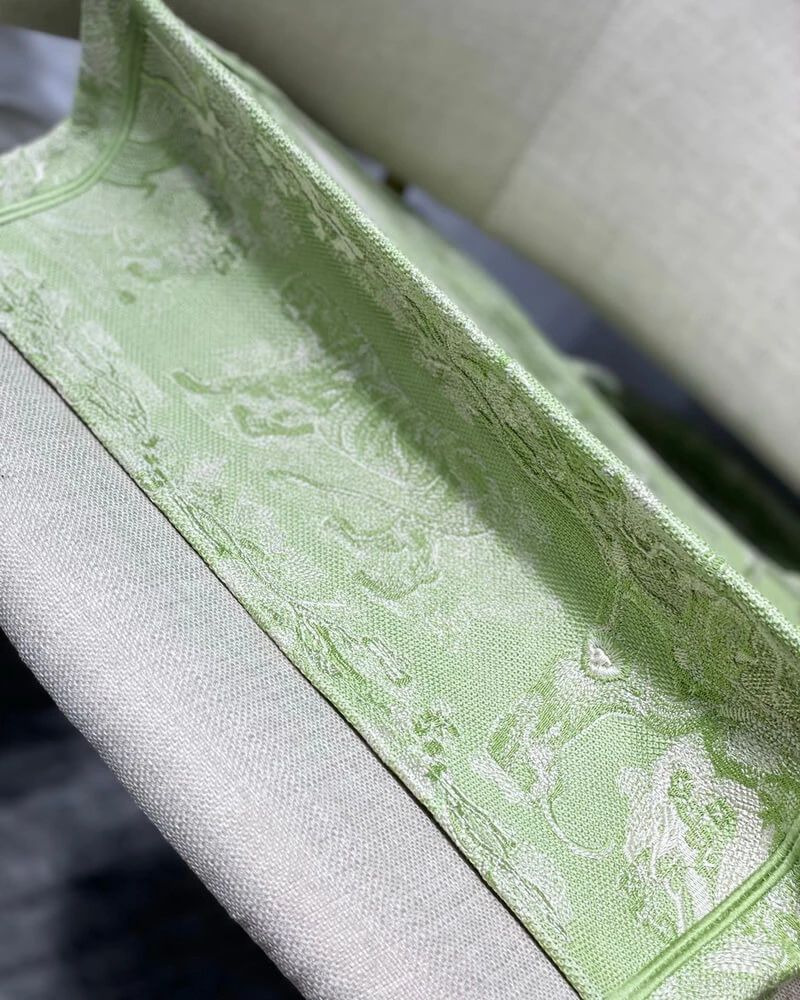 Discover a masterpiece of textile art with this exquisitely crafted carryall tote. Designed to seamlessly blend high fashion with everyday functionality, this bag is fully embroidered with a captivating pastoral-inspired pattern. The vibrant lime hue is accentuated by a unique reverse color design, creating a visually stunning effect that is both classic and contemporary. This tote offers a sophisticated way to carry all your daily essentials with effortless style.