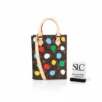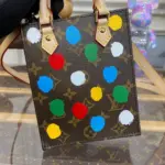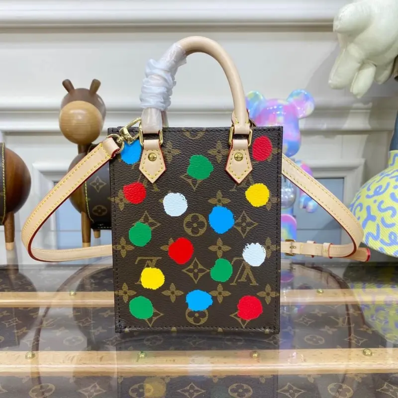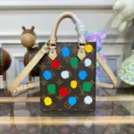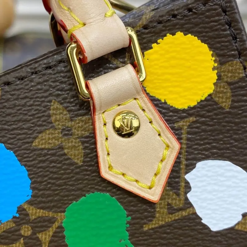 Experience a masterpiece of artistry and craftsmanship with this compact mini-tote, reimagined with an upbeat, artistic flair. This elegant bag is crafted from a durable coated canvas featuring a classic geometric pattern, playfully updated with a vibrant, three-dimensional painted dot motif. Its colorful and creative design makes it a user-friendly clutch that stands out as a unique statement piece.