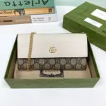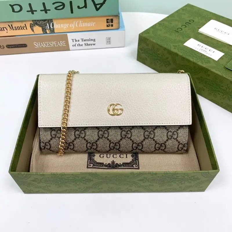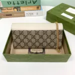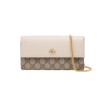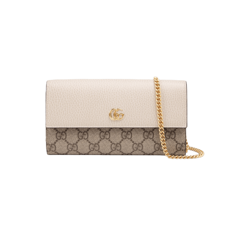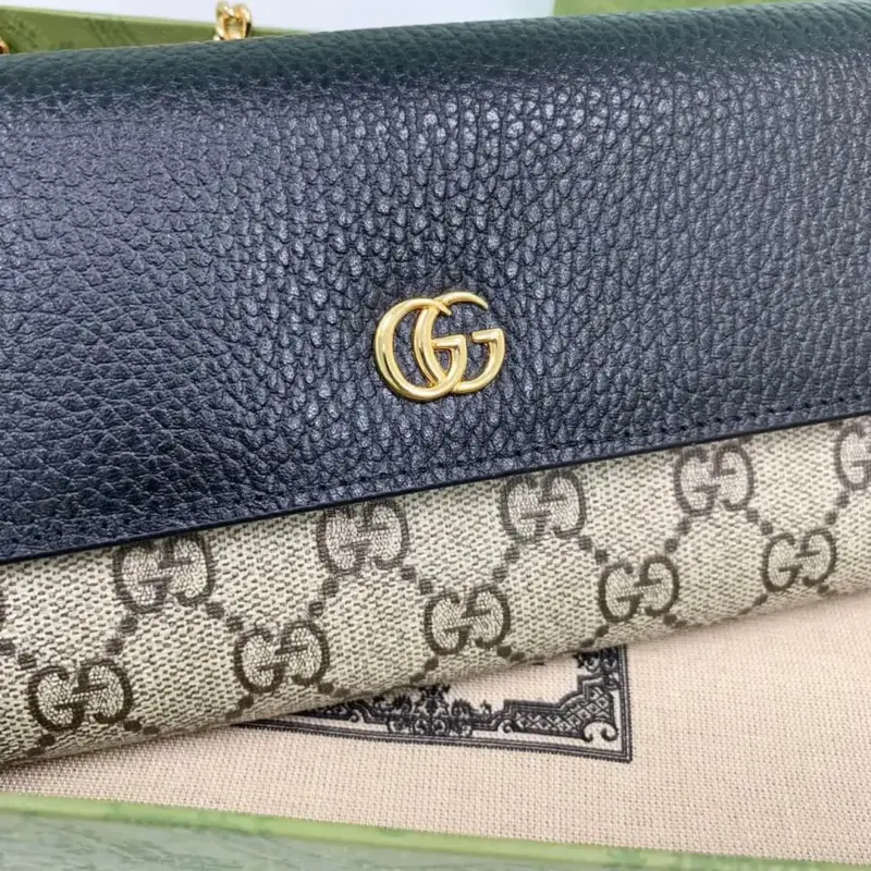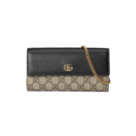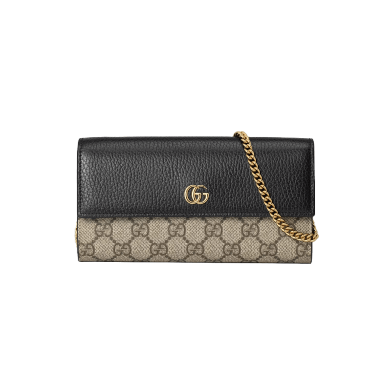 Discover the perfect blend of elegance and functionality with this slim wallet, expertly designed to transition from a wallet to a sophisticated mini bag. Crafted from a durable, geometrically patterned canvas and trimmed with smooth black leather, this accessory offers timeless style. It is elegantly finished with a polished gold-toned double-letter emblem and a delicate chain strap, making it an ideal companion for any occasion.