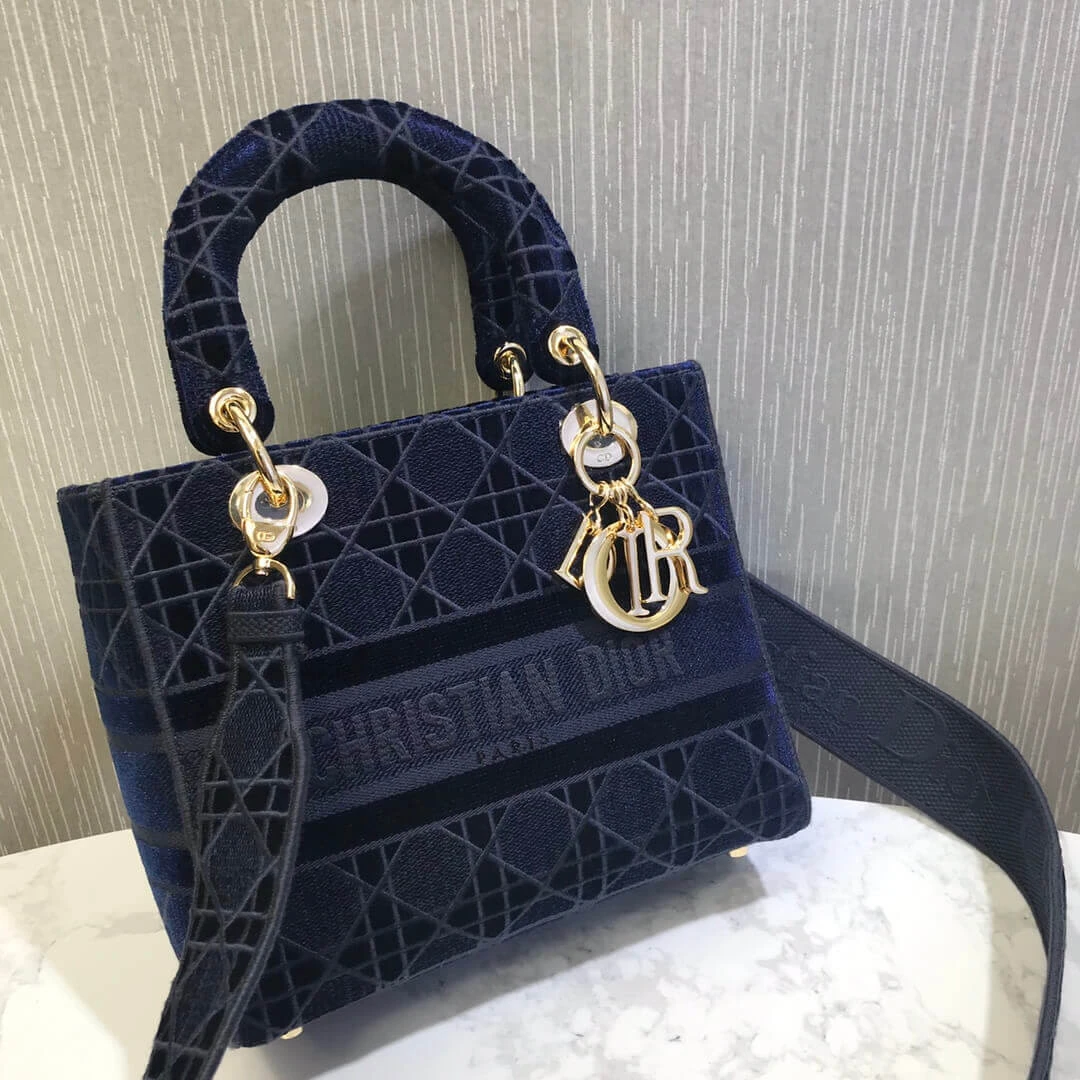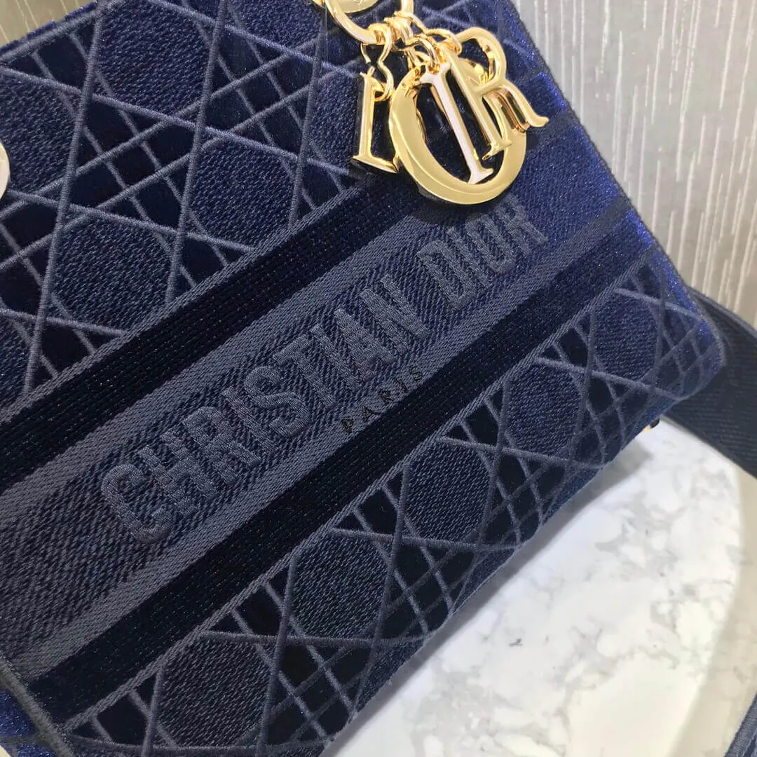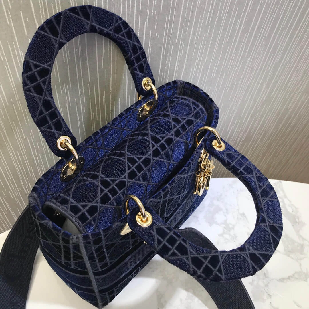 This handbag epitomizes a vision of elegance and beauty. A sleek and feminine bag crafted from rich blue velvet, it is fully embroidered with a classic geometric quilted pattern in a contrasting matte cotton thread for a stunning, textured effect. The structured silhouette is embellished with pale gold-finish letter charms, adding a touch of refined detail.