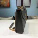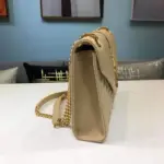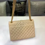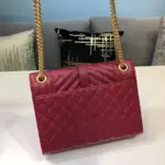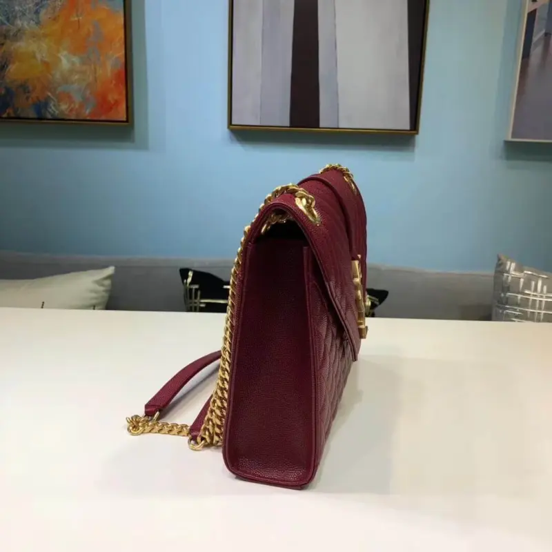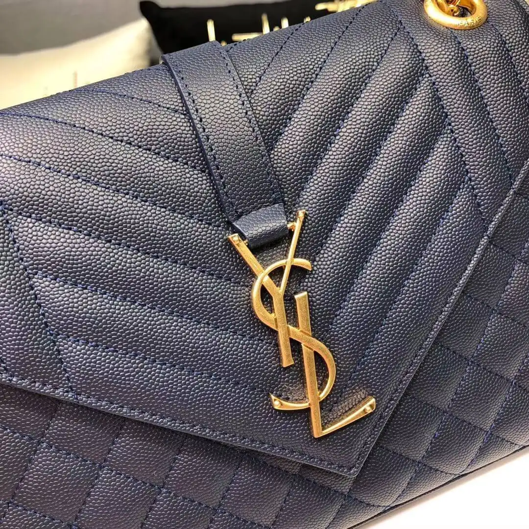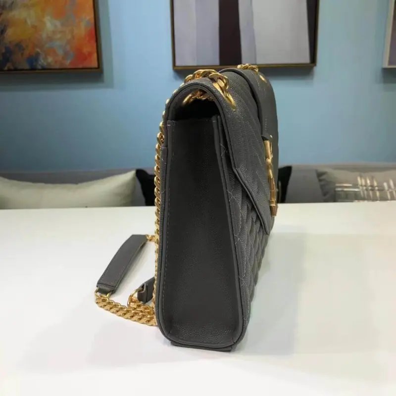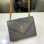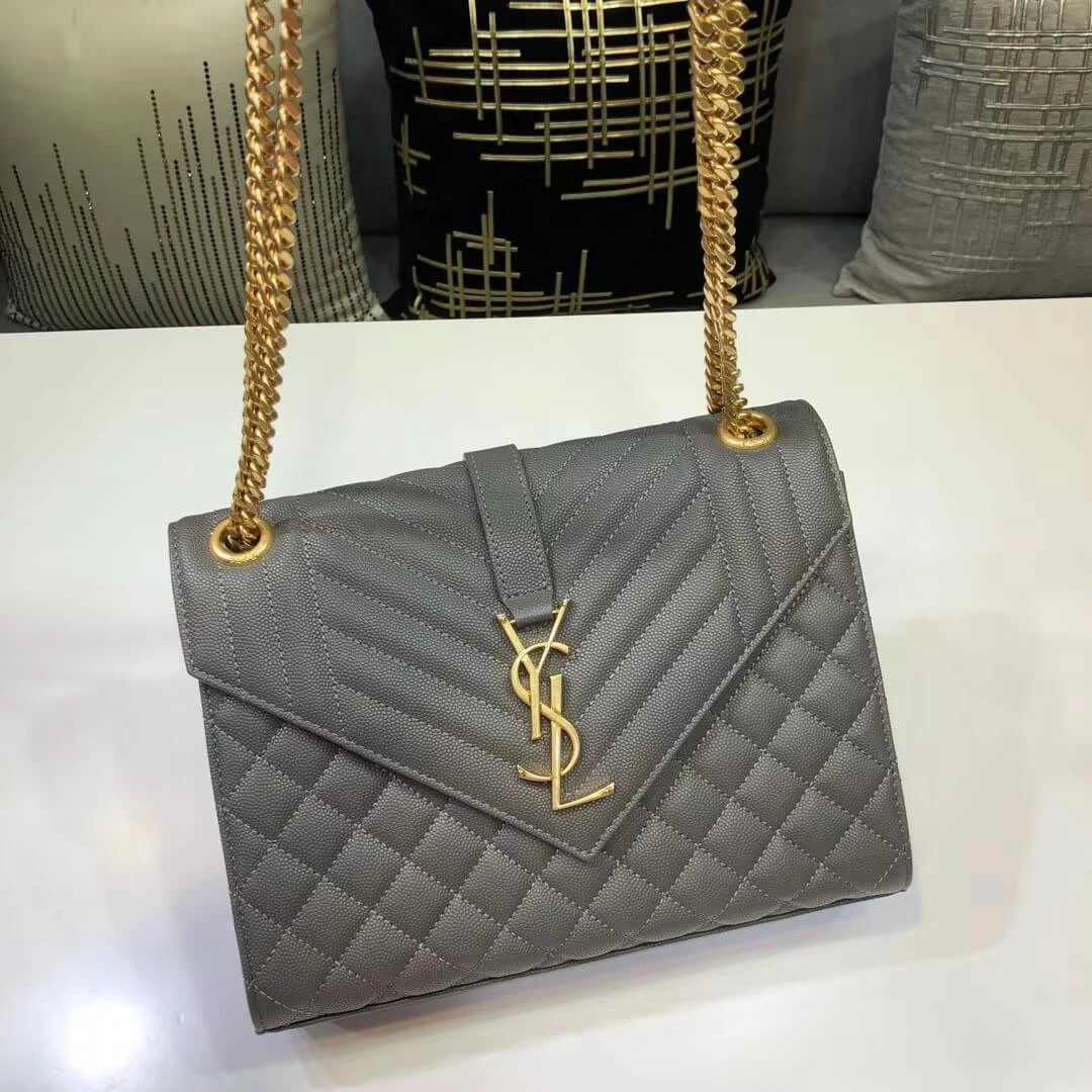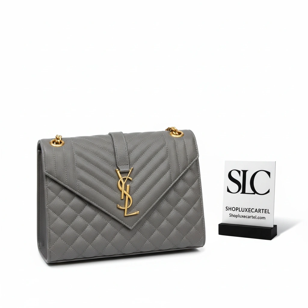 Discover a timeless accessory crafted for sophistication and versatility. This medium envelope-style shoulder bag is meticulously constructed from luxurious grained calfskin leather, showcasing an elegant mix of vertical and chevron quilted overstitching. The classic front-flap silhouette is punctuated by a distinctive metallic emblem, adding a touch of polished refinement to its structured design.