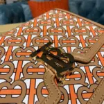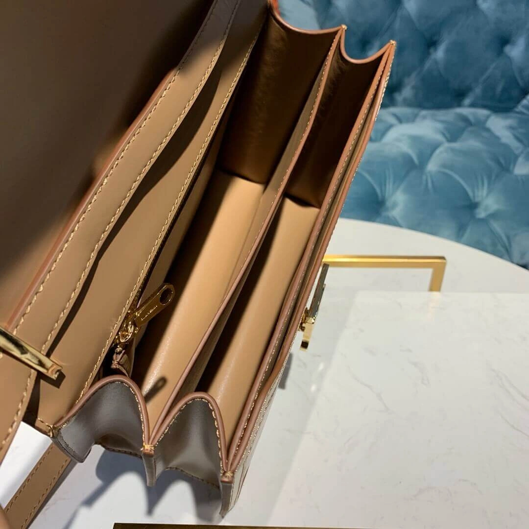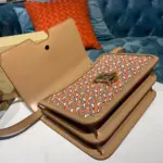 Designed for modern versatility, the polished chain strap can be easily adjusted for shoulder or crossbody wear. The well-organized interior features multiple compartments and pockets to keep essentials in order, all secured with a refined foldover top and a distinctive clasp closure.