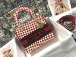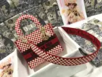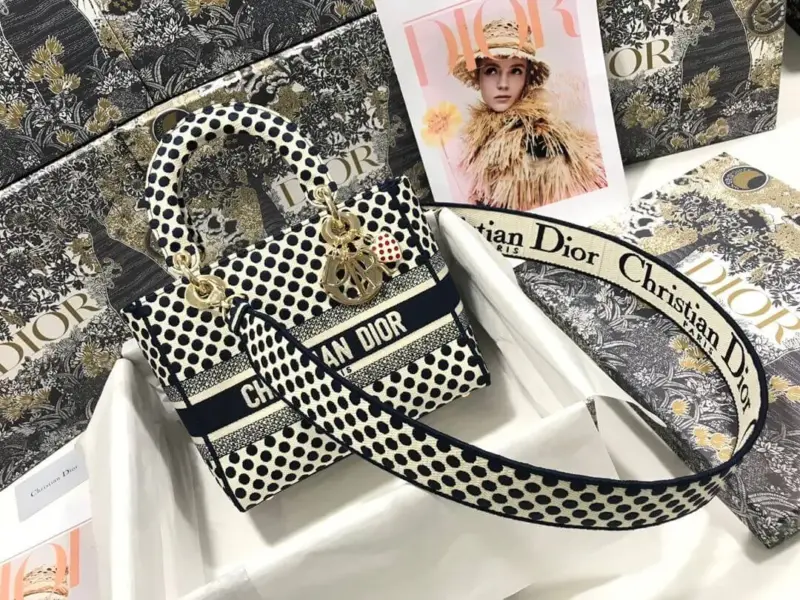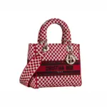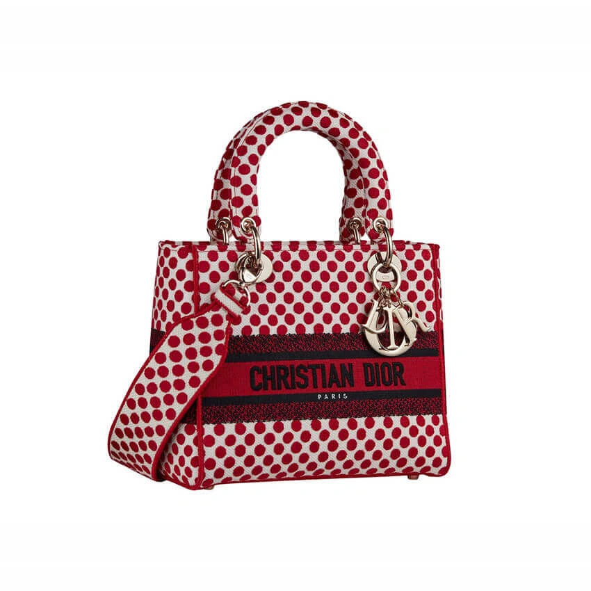 This handbag is the epitome of elegance and refined beauty, showcasing a sleek, feminine silhouette. The design is fully adorned with an intricate red polka dot embroidery, offering a timeless and romantic appeal. Pale gold-finish letter charms add a touch of sophistication to the classic shape.