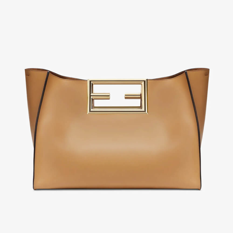 Discover timeless elegance with this beautifully crafted medium top-handle tote. Made from exquisite honey-colored calf leather, this bag showcases a structured yet soft silhouette, defined by its distinctive, oversized polished metal handles that add a touch of modern sophistication. Its clean lines and luxurious materials make it a versatile accessory for any occasion.
