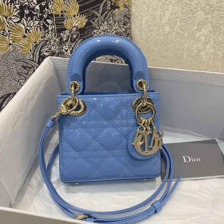 This top handle bag presents a timeless vision of elegance and beauty, captured in a sleek and refined miniature silhouette. Expertly crafted in glossy patent calfskin, the exterior is defined by its classic Cannage topstitching, creating a sophisticated quilted texture. The iconic shape is illuminated by polished, decorative letter charms that add a touch of distinction. Sized to carry daily essentials, this micro bag is a versatile companion for any occasion.
