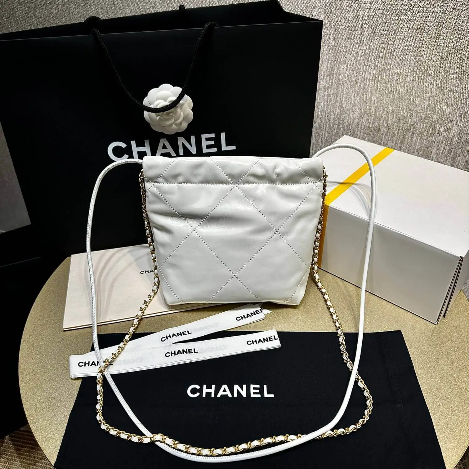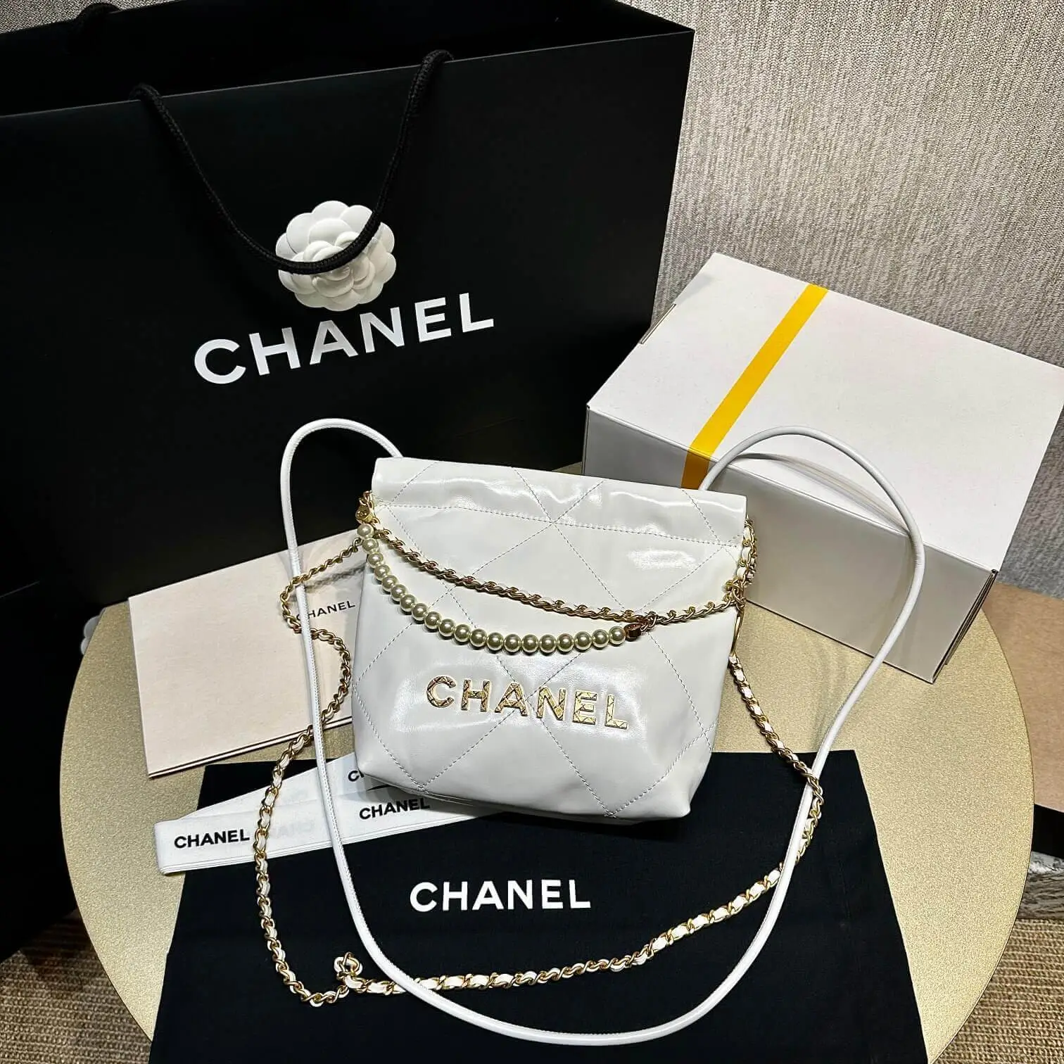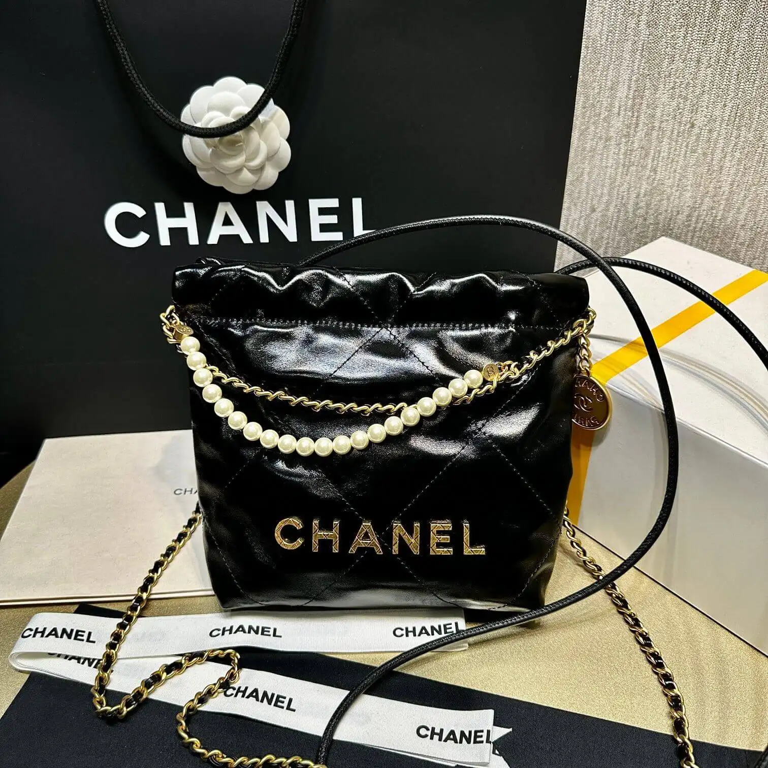 Mini 22 Shoulder Bag with Pearl Chain in Crumpled Calfskin AS3980