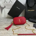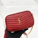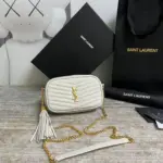 Designed for versatility, it features a mixed leather and chain strap that can be worn comfortably on the shoulder or as a crossbody. The design is accented with polished gold-toned hardware, a signature interlocking metal emblem, and a playful leather tassel charm, securing your essentials with a classic zip-around closure.